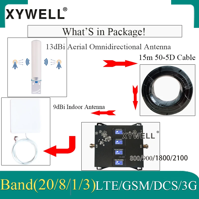 Этот усилитель подходит для Band20)LTE800MHZ GSM 900mhz DCS1800mhz WCDMA2100mhz частотный диапазон. Он может увеличить 2G 3G голосовые данные 4G.Если ваш сигнал 4G LTE 1800 (FDD band 3), этот повторитель также может увеличить данные 4g для вас.Пожалуйста, убедитесь, что вы можете получить по крайней мере 2 бар Band20)LTE 800 мгц 900 МГц (полоса 8)1800 МГц (полоса 3)WCDMA2100(FDD полоса 1) сигнал на открытом воздухе перед покупкой, В противном случае этот продукт не может вам помочь. Для улучшения сигнала в помещении необходим хороший внешний сигнал.