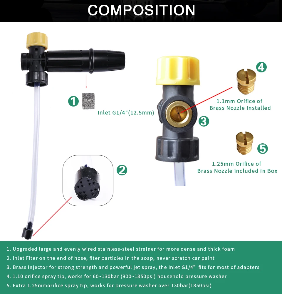 4. Пенная насадка поставляется с латунной насадки 1,1 мм, прекрасно работает с 60 ~ 130bar (900 ~ 1850psi), установка для мытья под давлением. Дополнительный 1,25 мм сопло в коробке, как правило, для мойки высокого давления выше 130bar (1850psi). Если вы имеете очень мощным установка для мытья под давлением, пожалуйста, разобрать 1,10 мм сопло из пенная насадка с плоская отвертка, и собрать 1,25 мм к вашему Высочайшее качество образования пены.