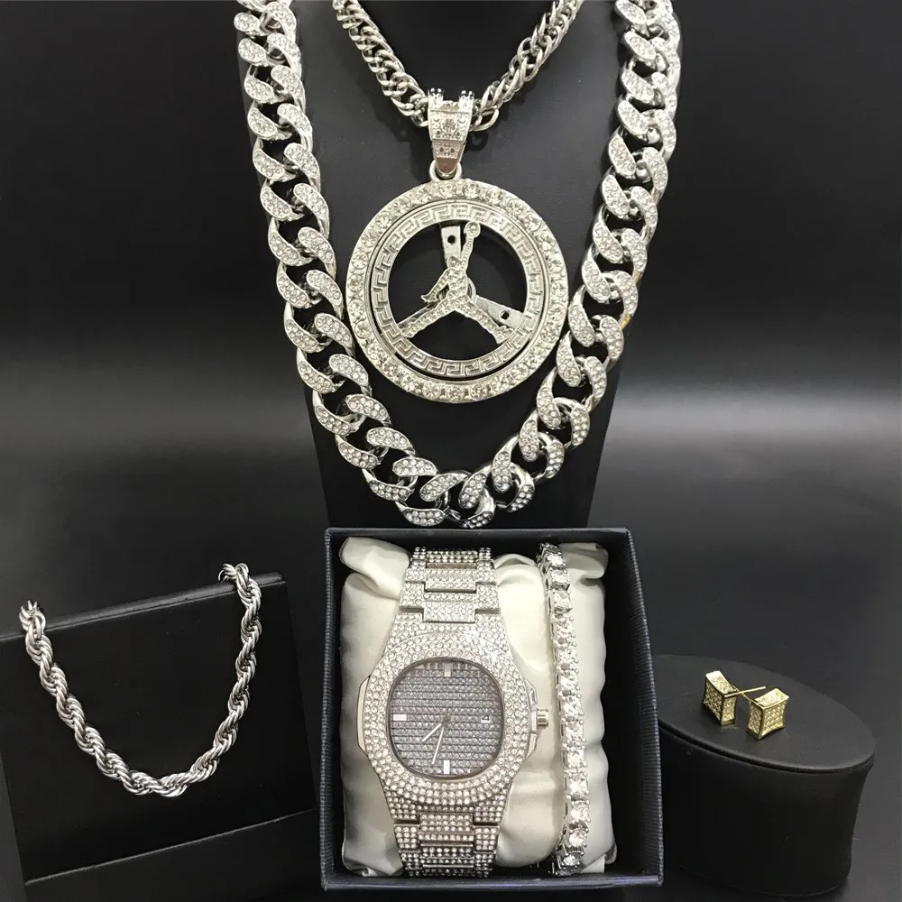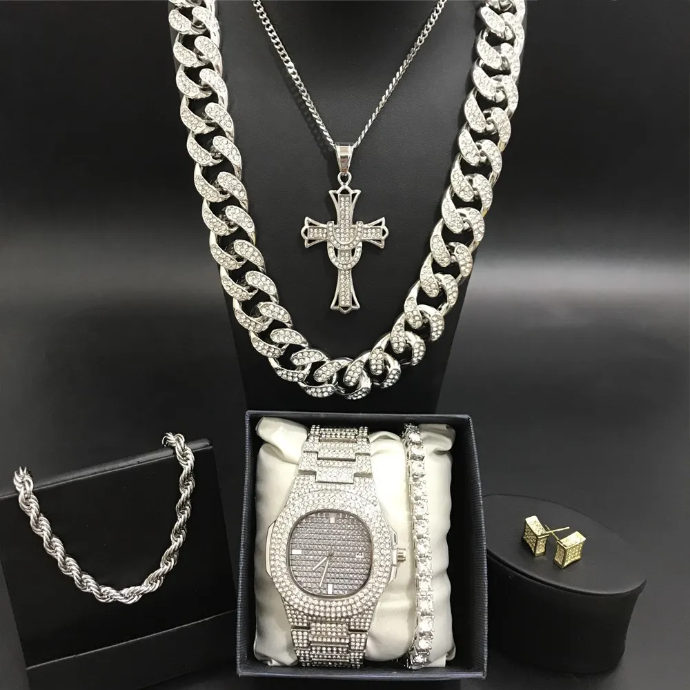 Роскошные мужские часы, ожерелье, браслет и кольцо, комплект из кубинской бриллианты, бриллианты, колье, цепочка, хип-хоп ювелирные изделия для мужчин