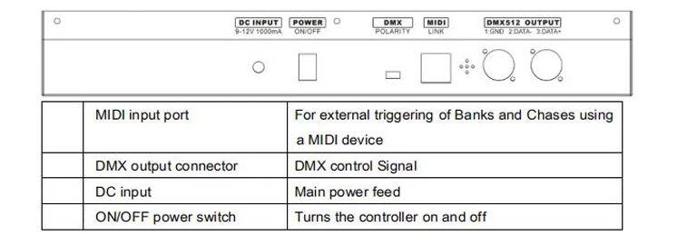 1. Стандарт DMX512/19902. Управление 24 интеллектуальными огнями до 16 каналов, всего 384 каналов3,30 банки 8 программируемых сцен4,6 программируемые погрешности 240 сцен5. Запись до 6 погрешностей с выцветанием времени и скорости6,16 слайдеров для прямого контроля каналов7.MIDI контроль над банками, помехами и затемнением8. Встроенный микрофон для музыкального режима. Встроенный микрофон для запуска музыки9. Автоматический режим программы контролируется скоростью и выцветанием времени ползунки. Затемнение Главная Кнопка10. Реверсивные DMX каналы позволяют приспособлению реагировать противоположно другим в погоне11. Ручное управление позволяет захватывать любое приспособление на лету12.Midi контроль над банками, погонами и затемнениемПереключатель полярности DMX13. Память о сбое питания14,4 бит светодиодный дисплей, 384 каналов15. Может работать с блоком питания