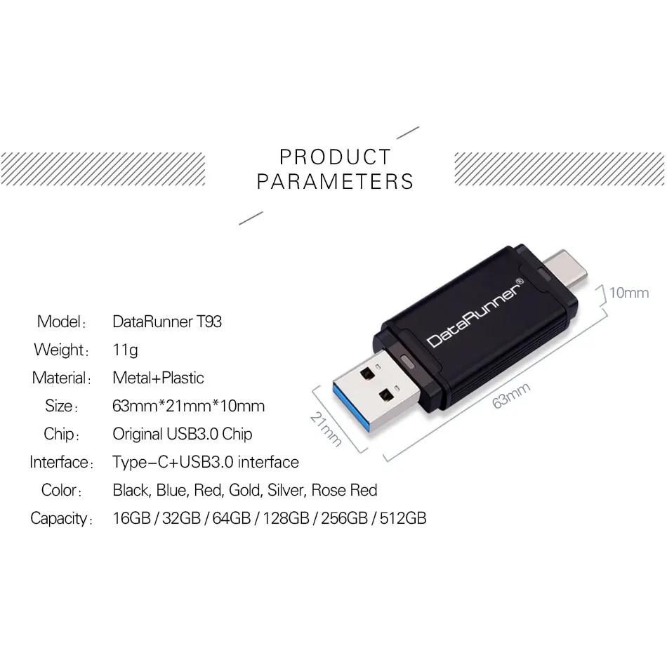 USB флеш-накопитель DataRunner TYPE-C, USB 3,0, флешка для Type-CПК 512 ГБ 256 ГБ 128 Гб 64 ГБ 32 ГБ, внешний накопитель 2 в 1