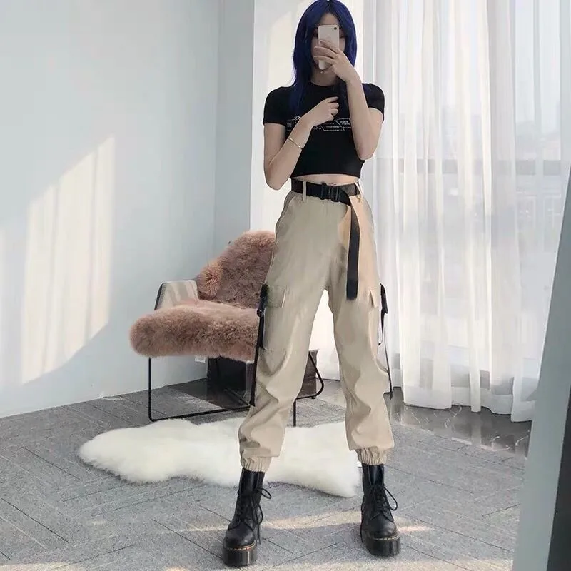 Брюки-карго Armygreen с ремнем, женские Капри, повседневные, с высокой талией, черные, в стиле Харадзюку, хип-хоп, для бега, школьная уличная одежда