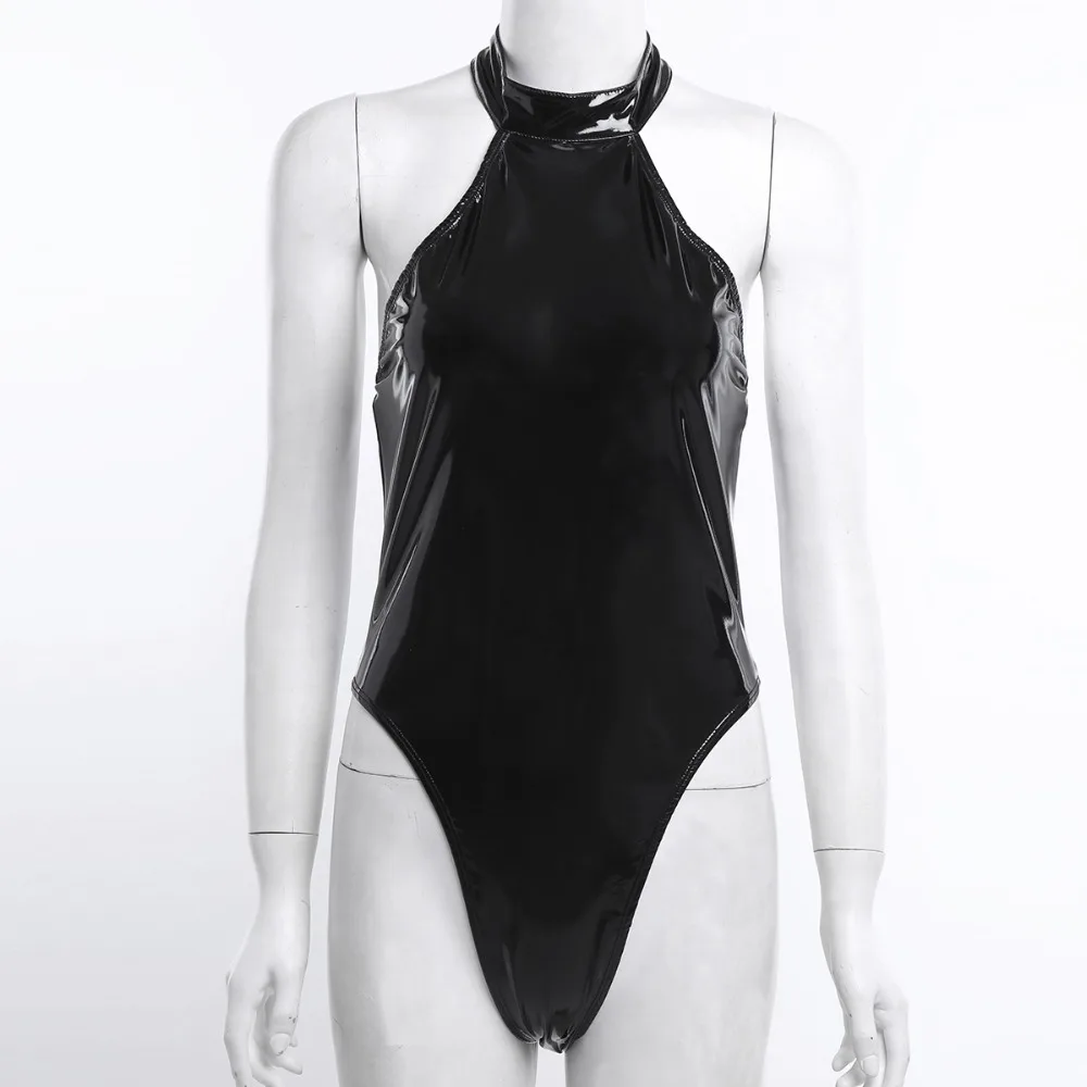 Женское боди, нижнее белье, Цельный купальник из лакированной кожи, с лямкой на шее, с открытой спиной, трико, боди, облегающий костюм, сексуальная клубная одежда, Rave Outfi