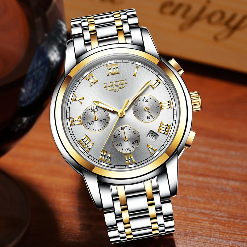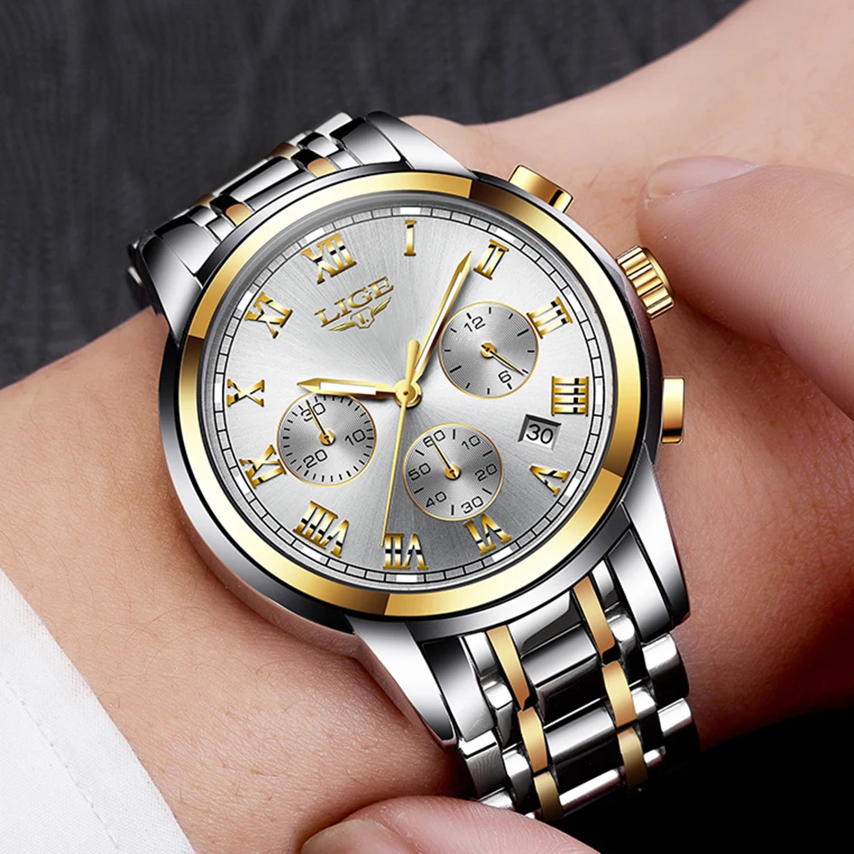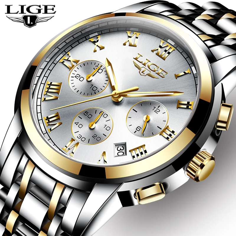 Часы наручные LIGE Мужские кварцевые, роскошные брендовые полностью стальные водонепроницаемые спортивные модные, с хронографом и датой