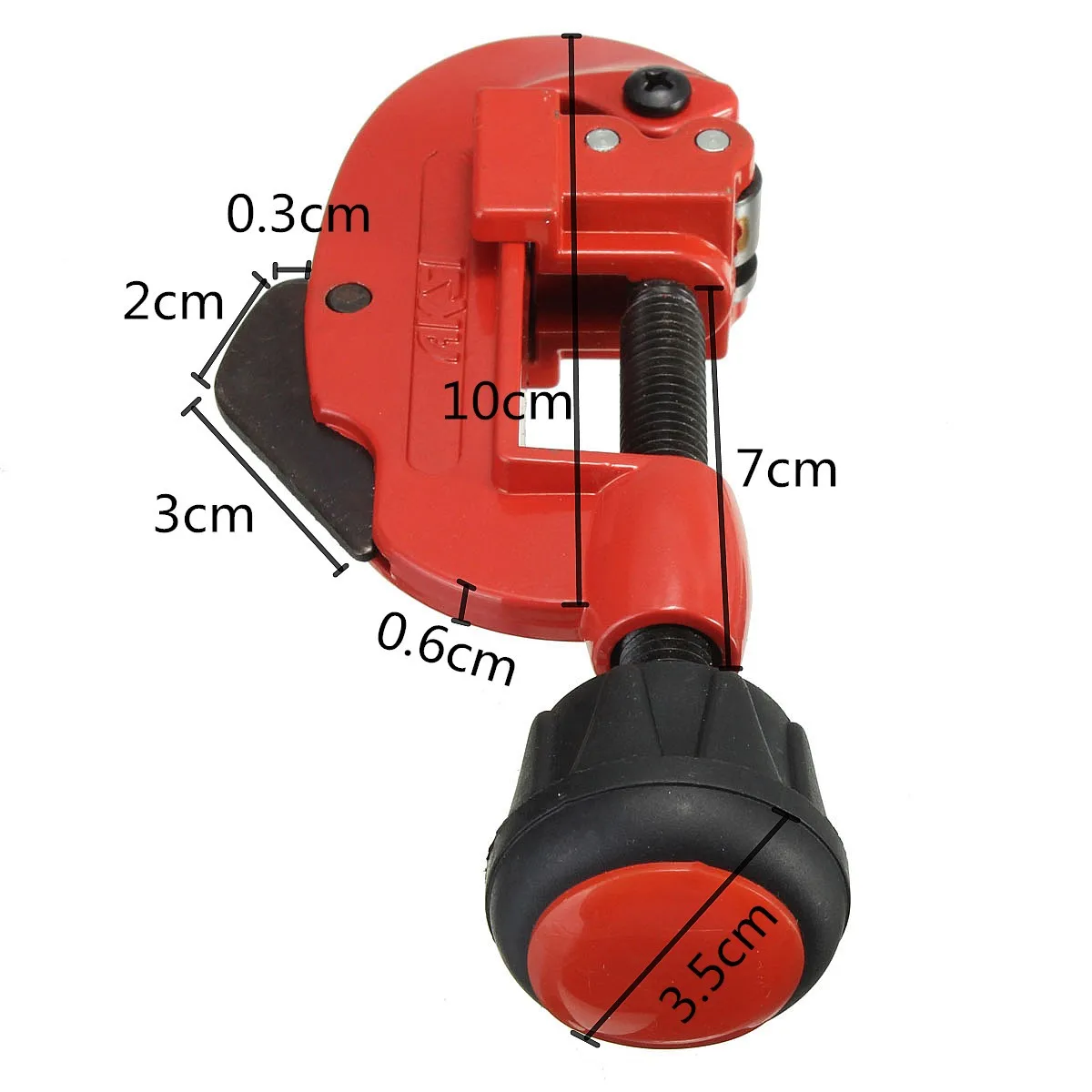 Особенности:Компактный дизайнЛезвие из закаленной стали и два роликовых пазаТруба доступа сбокуРазрезы по прямой линии и аккуратные трубыФиксация поворотной ручки, удерживает трубу в положенииЛегко отрегулировать и заменить лезвияПодходит для меди, латуни, алюминия, а также изготовленные тонкостенные трубы в комплекте со складкой в инструмент для развертывания и запасная режущая хранится в ручкаОтлично подходит для сантехников, электриков и механиков транспортных средствОбъем резки: 3-30 ммДлина: прибл. 18 см/7,09"