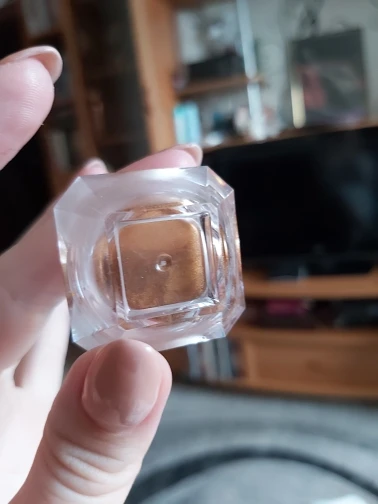 Очень шикарная зеркалка! В баночке довольно много, хотя и дно у нее выпуклое. Наносится и полируется легко, на типсе на топ с липким слоем, край покрыла топом сверху, все равно блестит чудесно! Очень рекомендую, и товар и продавец великолепны!