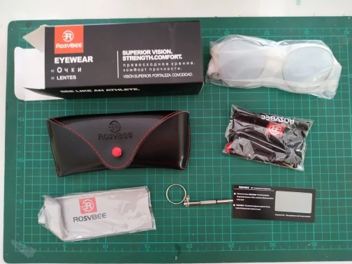 отличные очки,в комплекте отвертка,мягкий чехол,жесткий чехол,салфетка для протирки стекол.Очки монохромные,на солнце темнеют,очень легкие.Спасибо,продавец надежный,рекомендую