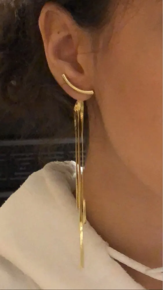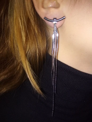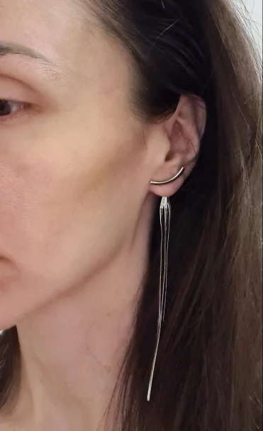 Красивые, легкие, крепление гвоздиком, есть 2 вида заглушек (если хотите носить только переднюю часть без висюлек) + третья - это сами висюльки, к ним припаяна металлическая заглушка. Можно носить как моно серьгу, или в одном ухе с висюлями а в другом без. Классно и с футболкой и с платьем. Детали лаконичные, форма простая геометрия, можно считать базой, подо всё.