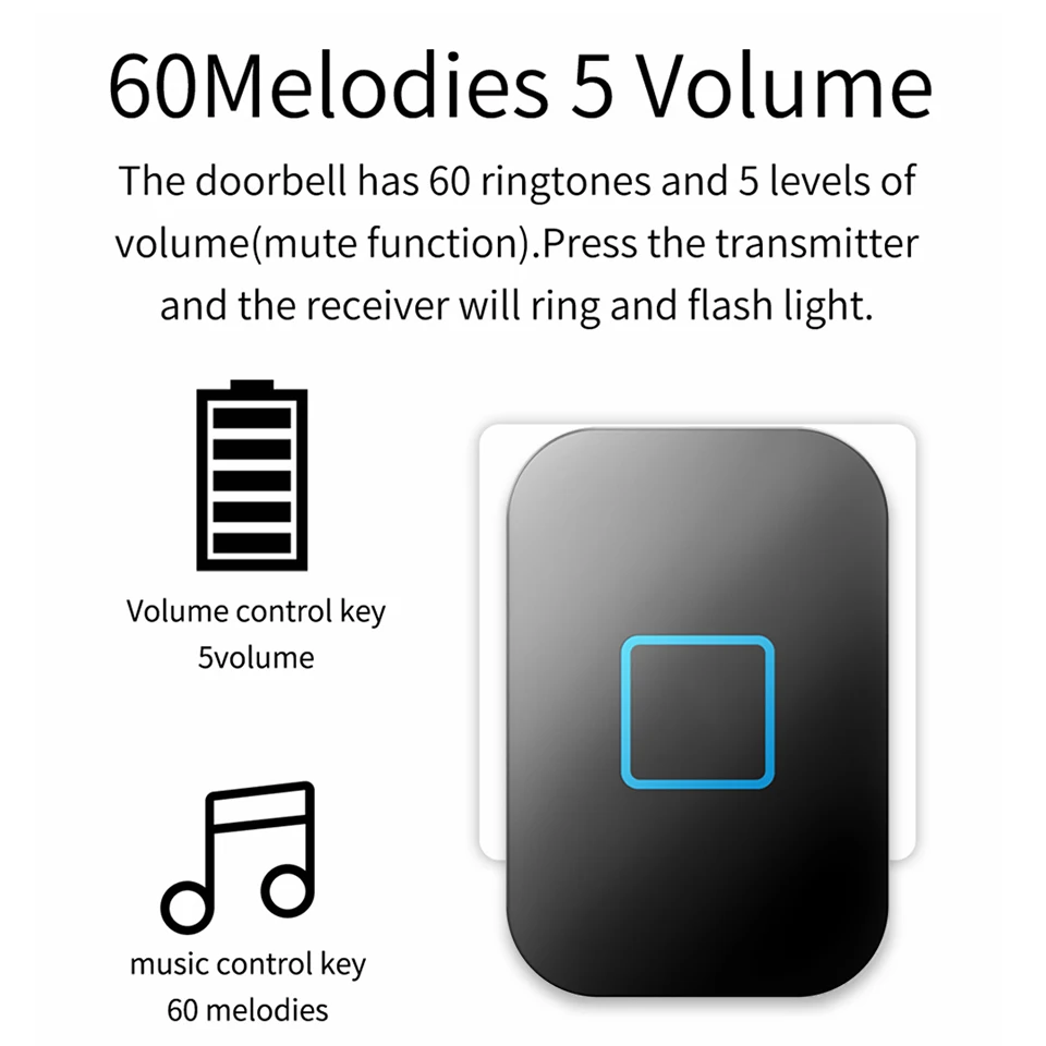 1. Нажмите кнопку, супер обучающий код может свободно научиться совпадать, может быть неограниченно совпадающий приемник. 2. Вместо использования аккумулятора Кнопка преобразует кинетическую энергию в электрическую энергию и посылает сигнал при нажатии. 3. Передатчик может нормально работать в снегу или при высоких температурах, водонепроницаемый и пыленепроницаемый. 4. Если несколько кнопок сопряжены с одним или несколькими приемниками в одной системе, каждая кнопка может быть настроена на другой рингтон. 5. Функция памяти при отключении питания: Включите питание снова после выключения, нет необходимости повторно настраивать и блокировать мелодию звонка. 6. Приемник доступен в различных вариантах вилок, вилок US/EU/UK и адаптеров AU, подходящих для большинства стран. 7. Привлекающая внимание подсветка мигает, когда кто-то толкает дверной звонок. Особенно подходит для пожилых, глухих и беременных женщин. 8. Напряжение приемника 220 В. 9. Приемник находится на расстоянии 150 метров (на открытой местности), на что могут влиять окружающие условия и препятствия. 10. Приемник имеет 60 рингтонов на выбор, громкость составляет 0-110 дБ на 5 уровнях. 11. Просто подключите приемник к электрической розетке, кнопочный передатчик можно приклеить к двери с помощью прилагаемой клейкой ленты. 12. Размер передатчика: 70*46*24 мм, Размер приемника: 92*62*32 мм Примечание: Кнопку нельзя установить на железную дверь, так как она будет мешать сигналу. Если приемник не звонит при нажатии кнопки после получения дверного звонка, Выполните сопряжение дверного звонка.