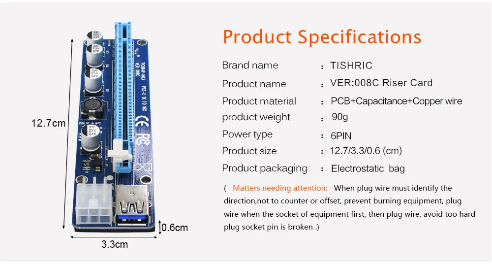 Райзер TISHRIC VER 008C Molex 6 Pin PCIE PCI-E PCI Express, 1X до 16X, удлинитель 60 см, USB 3,0 кабель для майнинга биткоинов