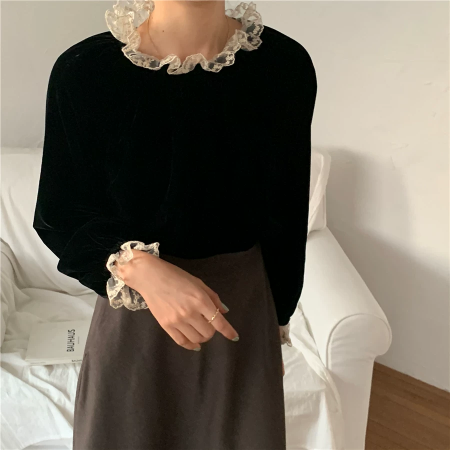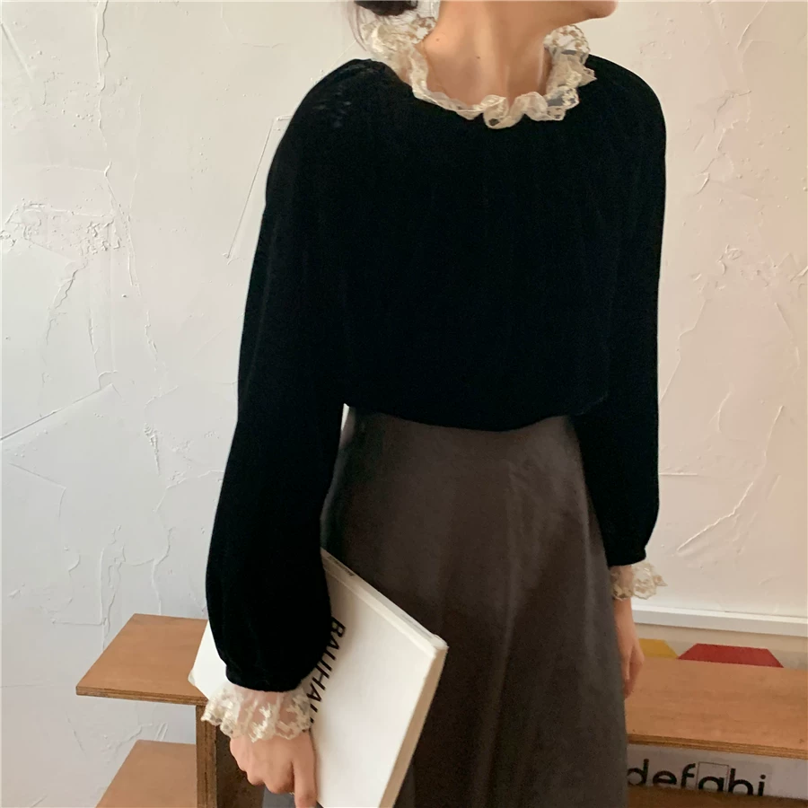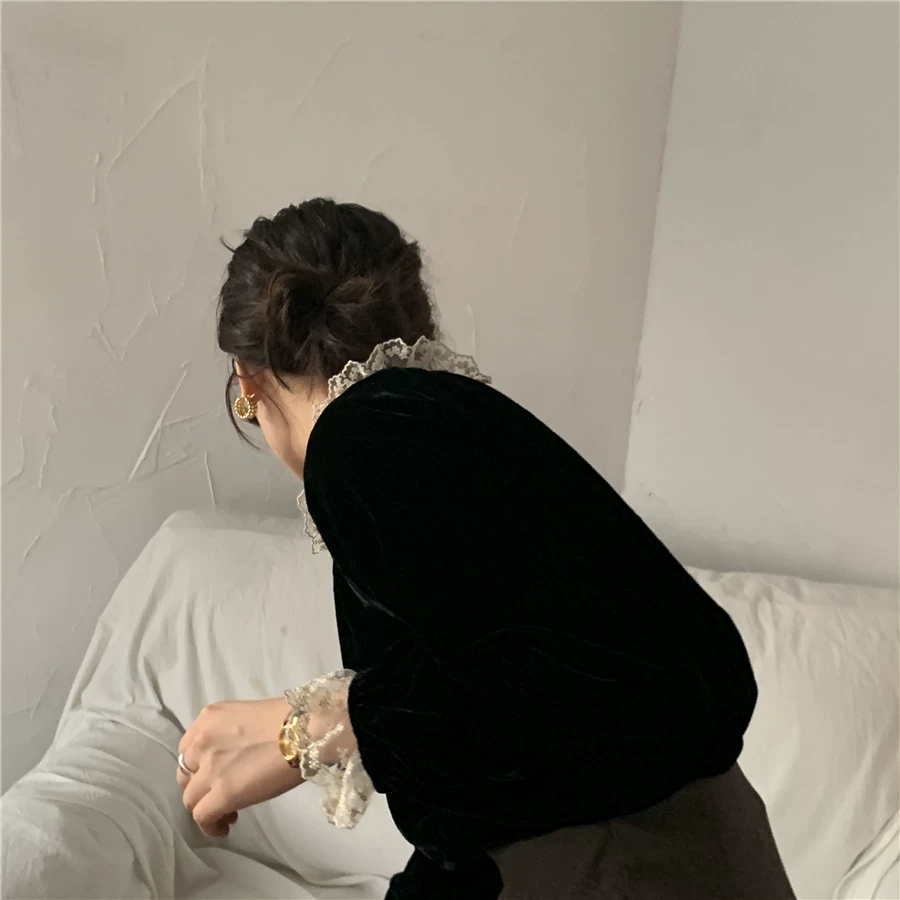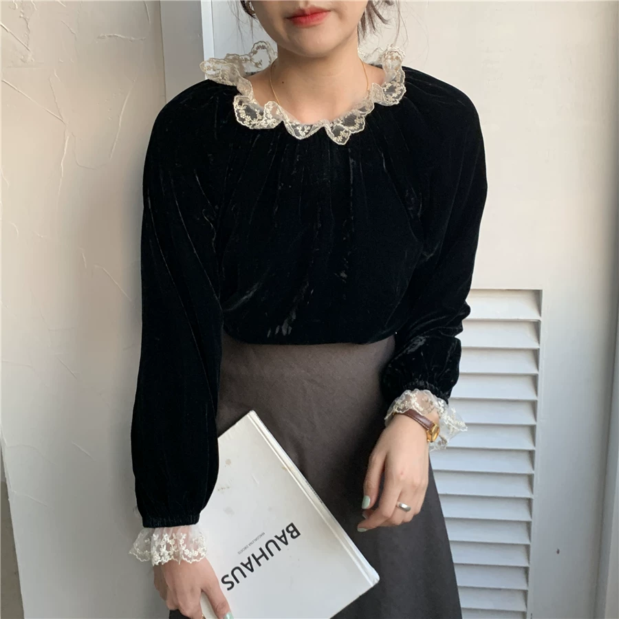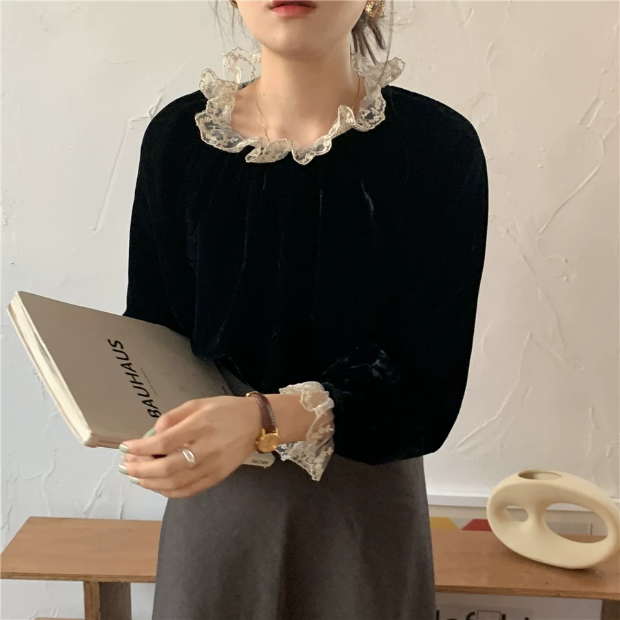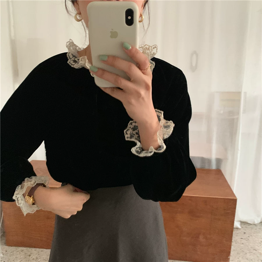 Шикарная кружевная рубашка с рукавом-колокольчиком, женские корейские милые женские рубашки в стиле Харадзюку, ольччан, японская кавайная Женская винтажная одежда для женщин