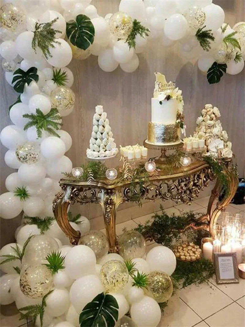 Шары воздушные белые с золотом, с зелеными листьями, арочный комплект, 98 шт.