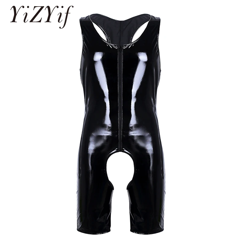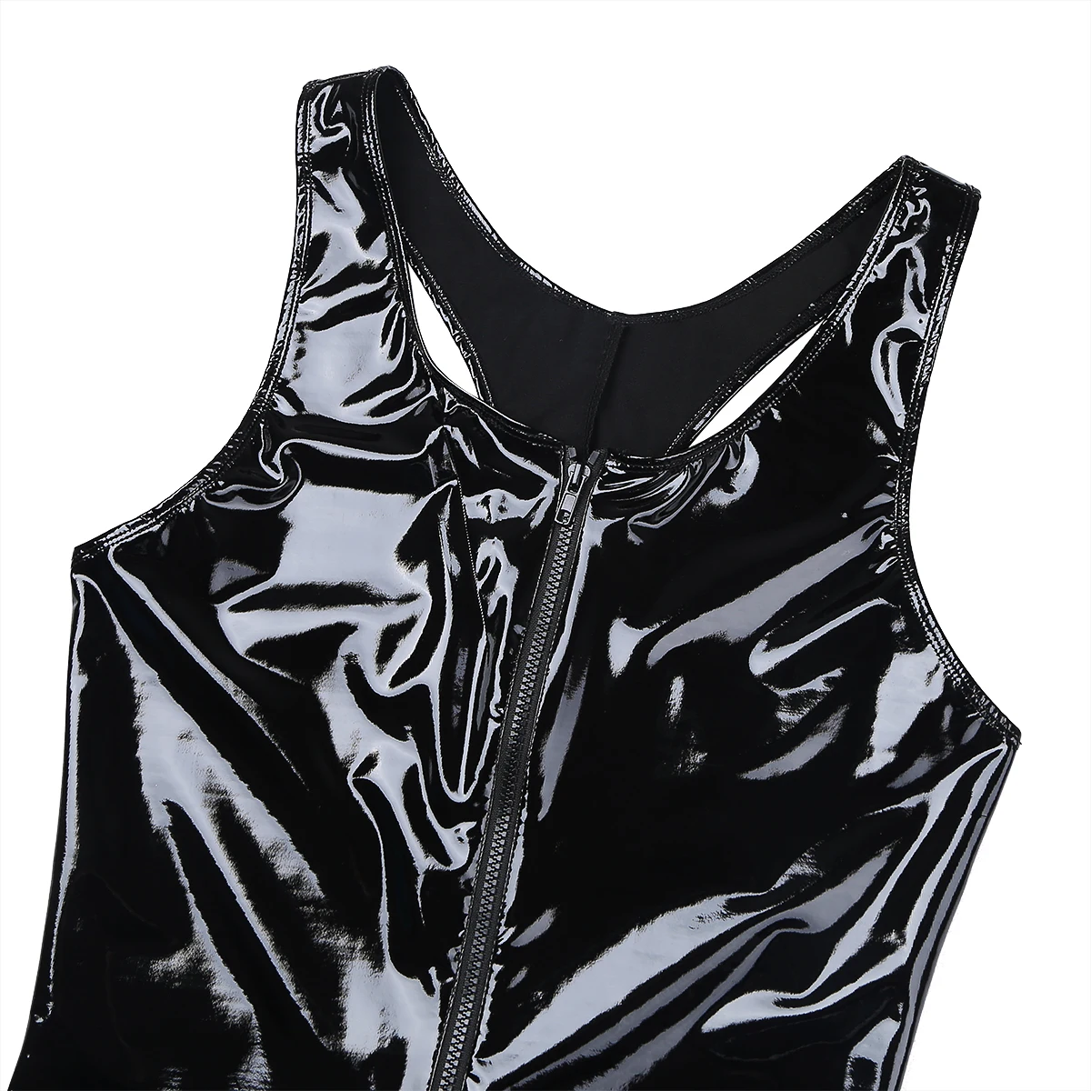 Сексуальная мужская майка из лакированной кожи, цельный, без рукавов, с молнией спереди, с вырезом, боксеры, трико, боди, нижнее белье