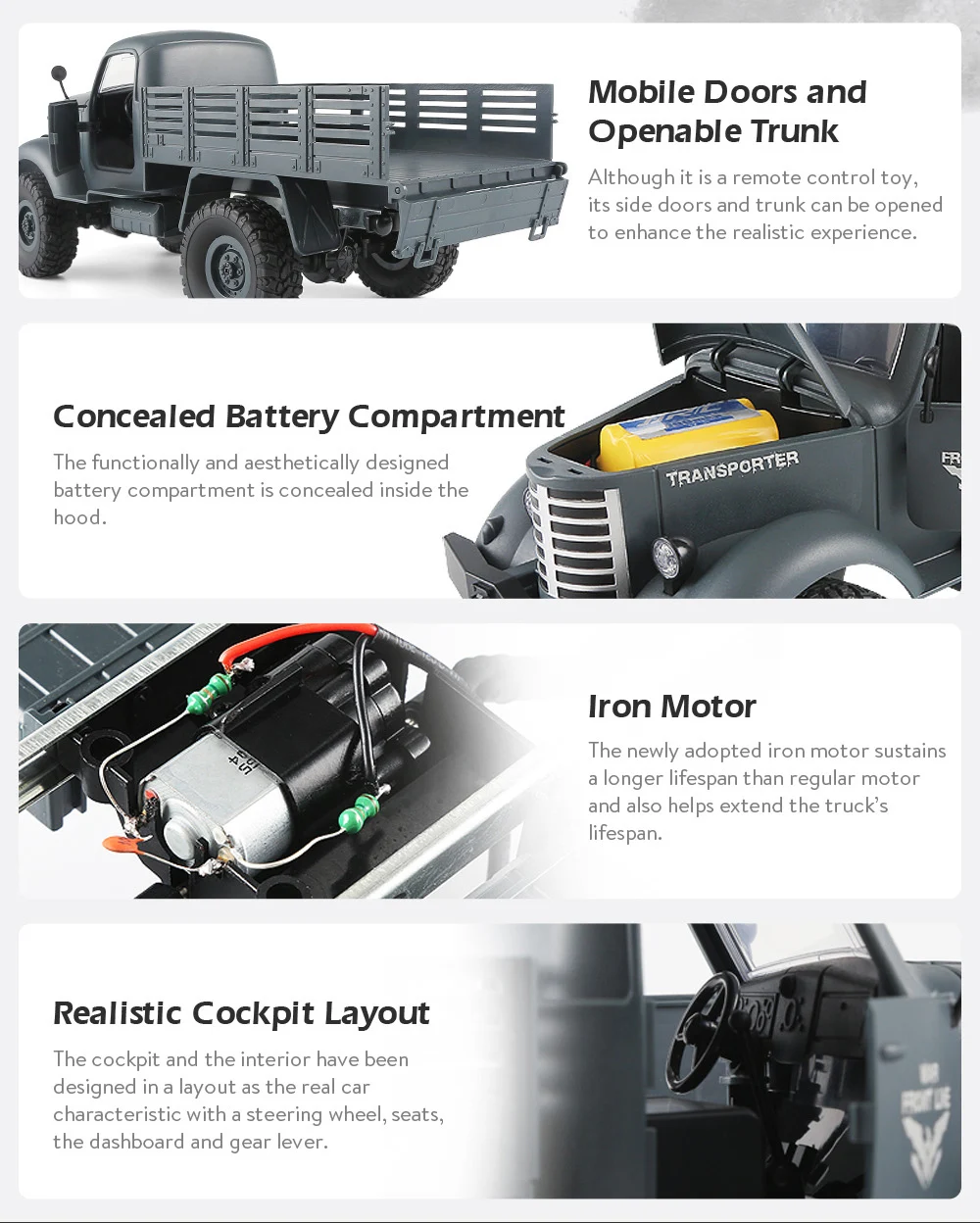 Военный грузовик Q61 2,4G 4WD с уникальным дизайном и выдающимся внешним видом оснащен прочными и хорошо спроектированными шинами и колесами для обеспечения высокой скорости и стабильной работы. С 2,4 ГГц соотношение система управления, два или более rc автомобилей может быть гоночный вместе без пульта дистанционного недоразумений.