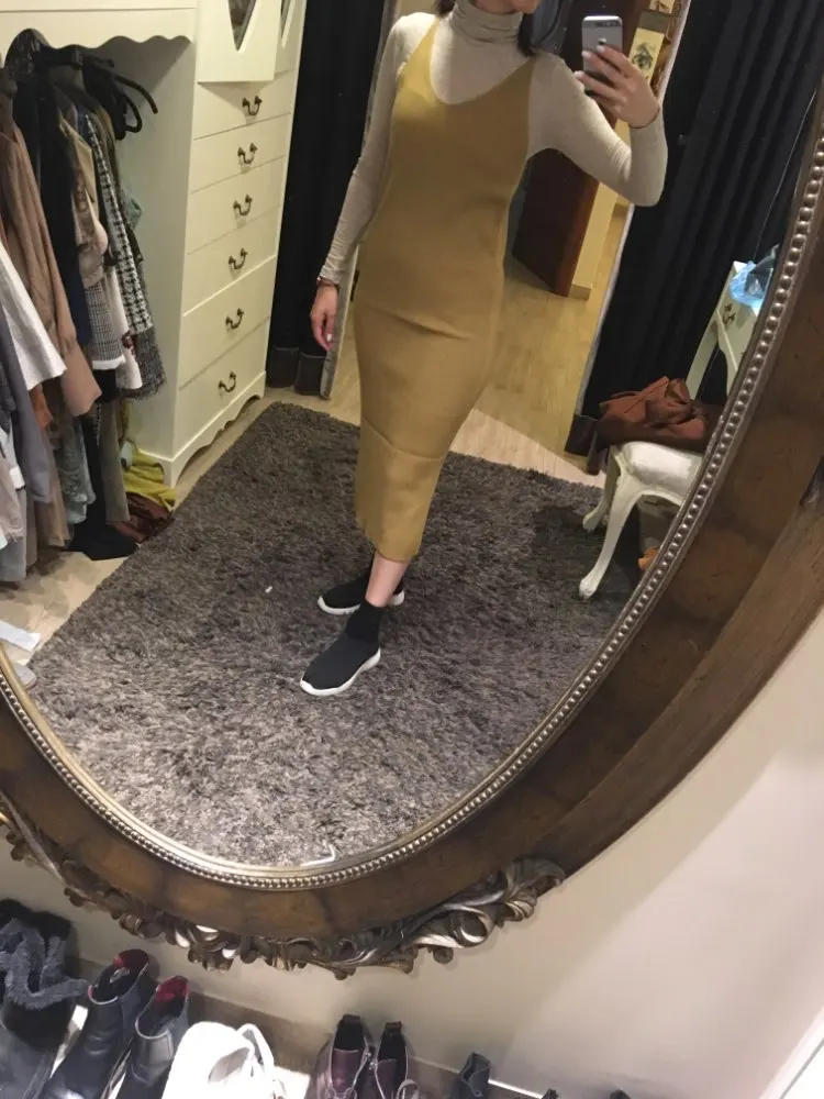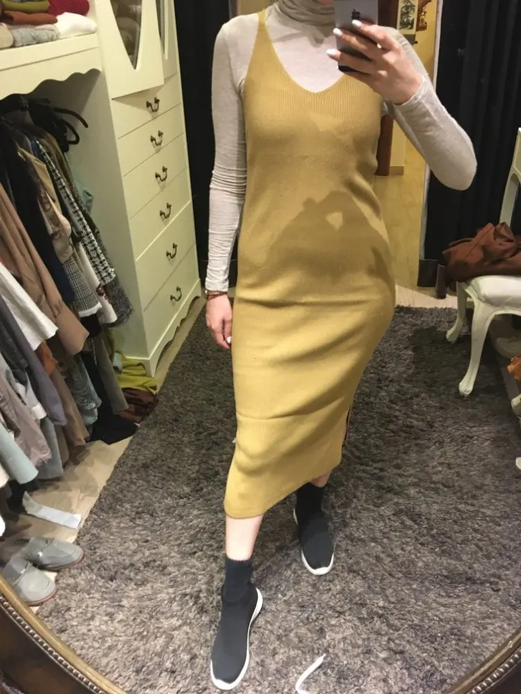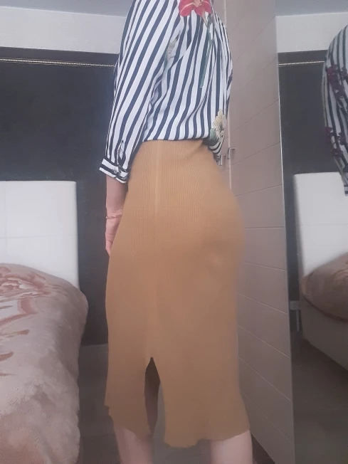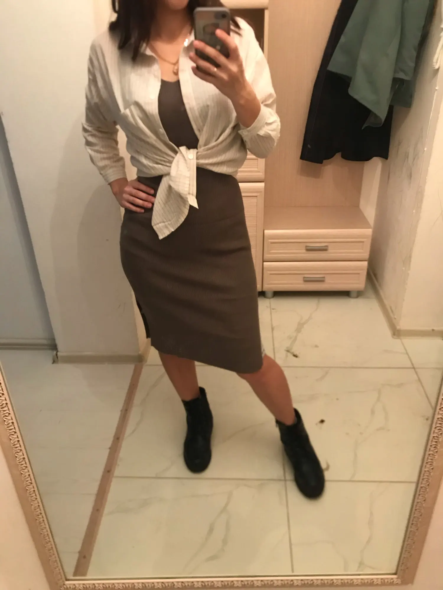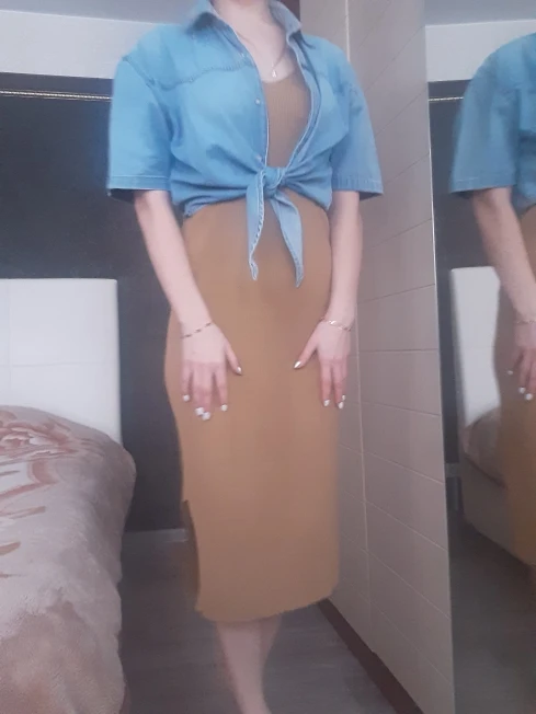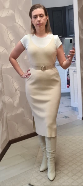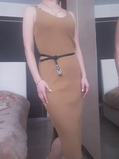 Материал вязанный, очень приятный к телу. Мой рост 164 см, длина на уровне колени. На 87-70-97, в облипку, но не в обтяжку. Можно одевать с рубашкой (сверху одеть или с внутри), можно с ремешком (но лучше без). Буду экспериментировать. Заказала 13.11.20г. пришёл заказ в Астану 9.01.21г. Почти 2месяца, но продавец предупредил связи с распродажей и с ковид будет задержки посылкой.