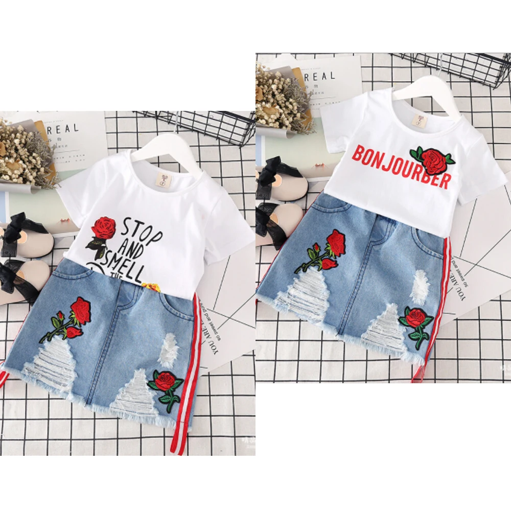 2 шт.комплект, футболка с коротким рукавом и джинсовая юбка с вышивкой