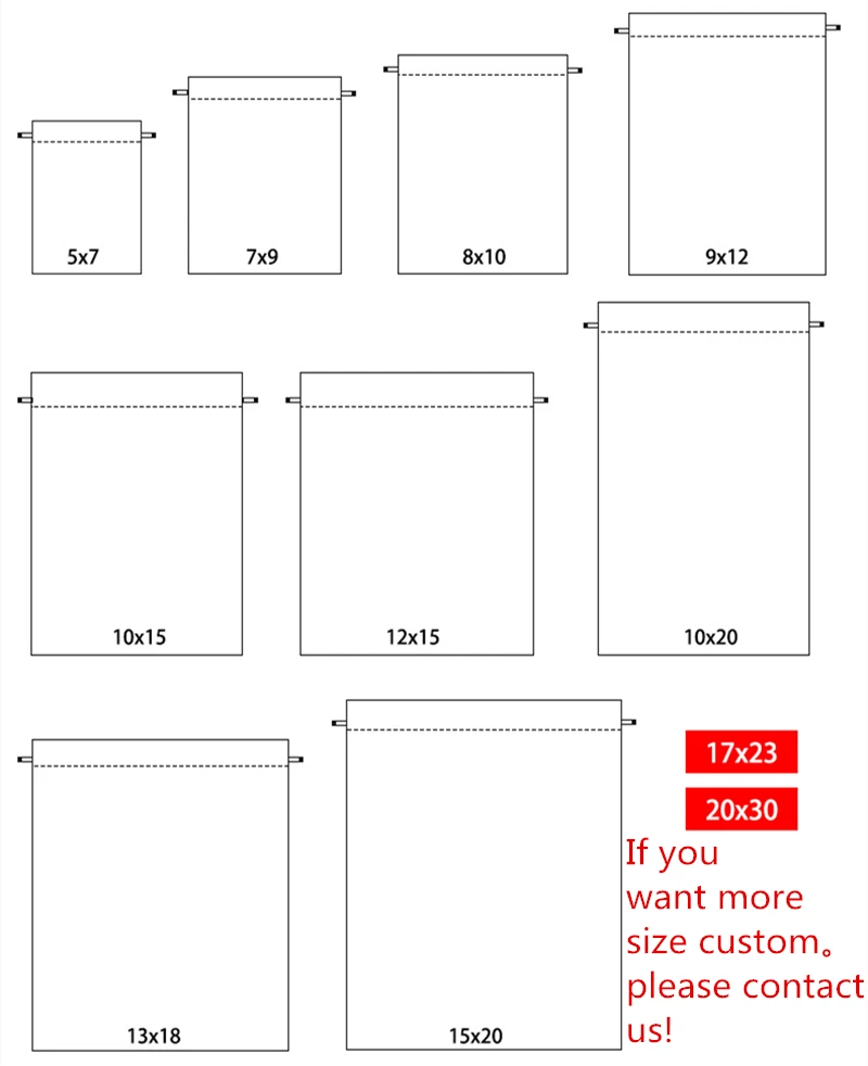 Размер: 5x7 см, 7x9 см, 8x10 см, 9x12 см, 10x15 см, 11x16 см, 13x18 см, 15x20 см, 17x23 см погрешность: 0-1 смЦвет: белый, красный, красный, винный, фиолетовый, серый, зеленый, черный, королевский синий, розовый, розово-красный.