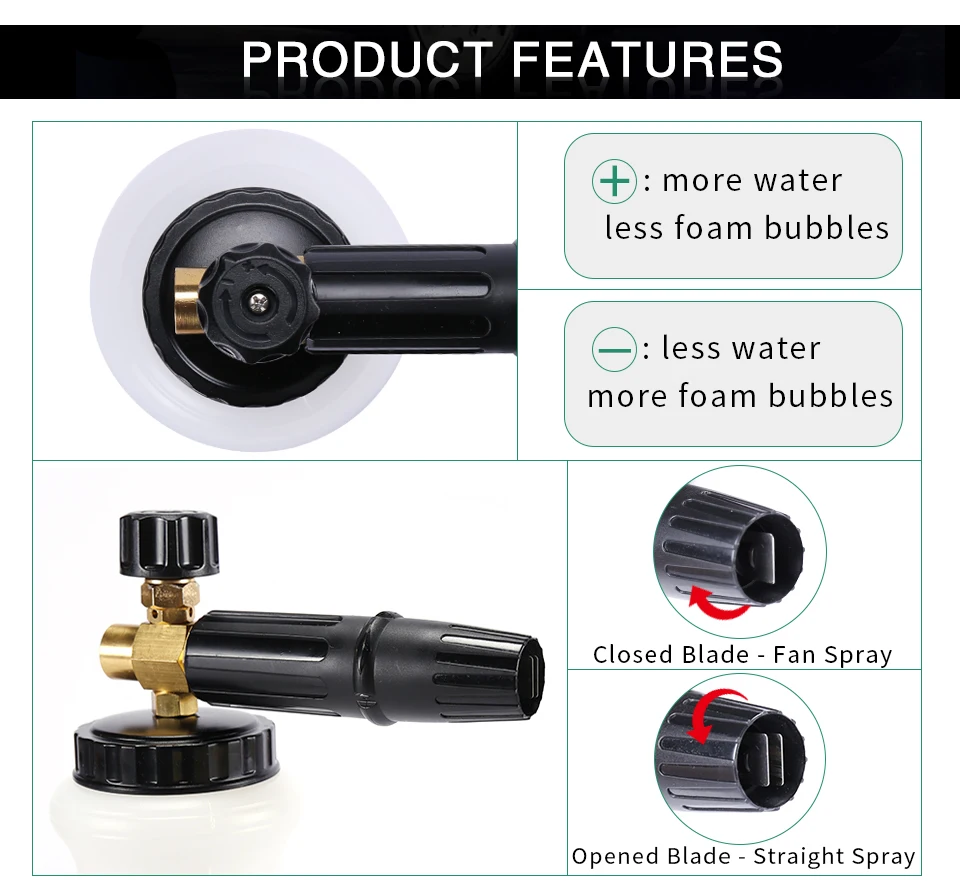 2. Основной корпус из латуни и металла для тяжелых условий эксплуатации, не ржавеет и долговечен; Точно изготовленное сопло и ключевые детали обеспечивают обильную и плотную пену с меньшим соотношением мыльной смеси.