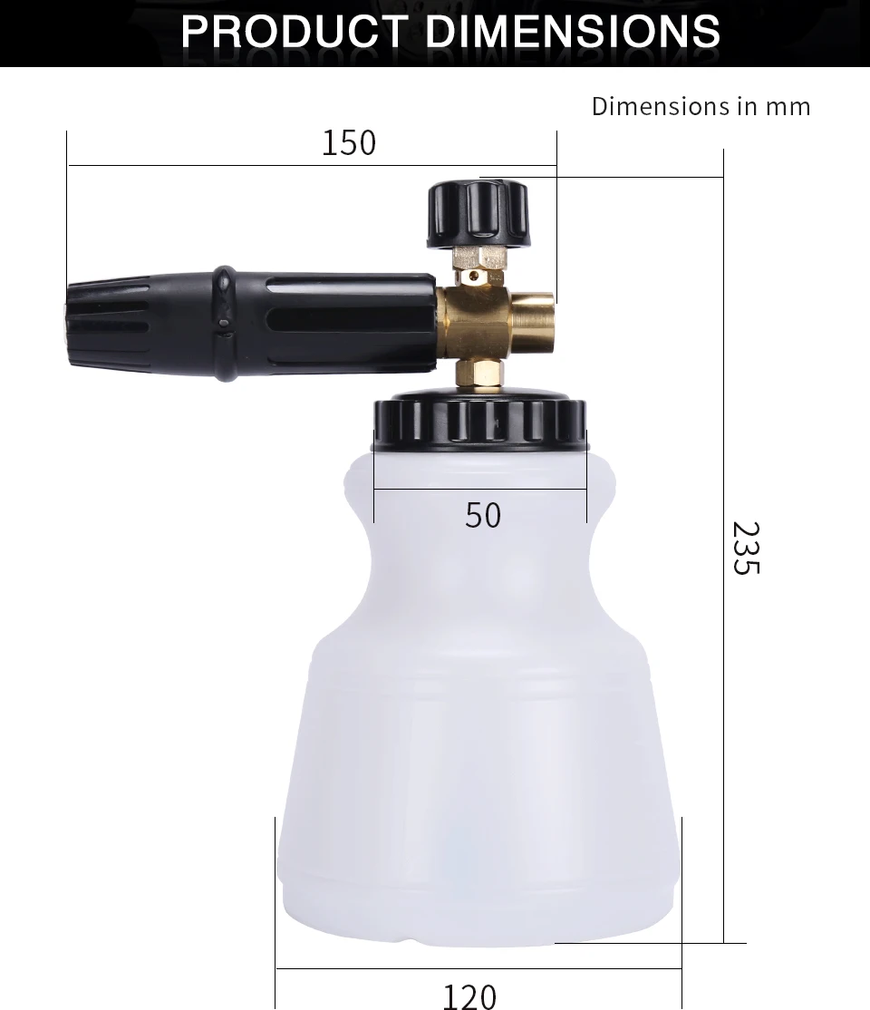 1. Пенная насадка прекрасно работает как с электрическими, так и с бензиновыми мойками давления между 60 ~ 300 бар (870 ~ 4500psi). Однако он не подходит для садового шланга или ленточного водяного шланга.