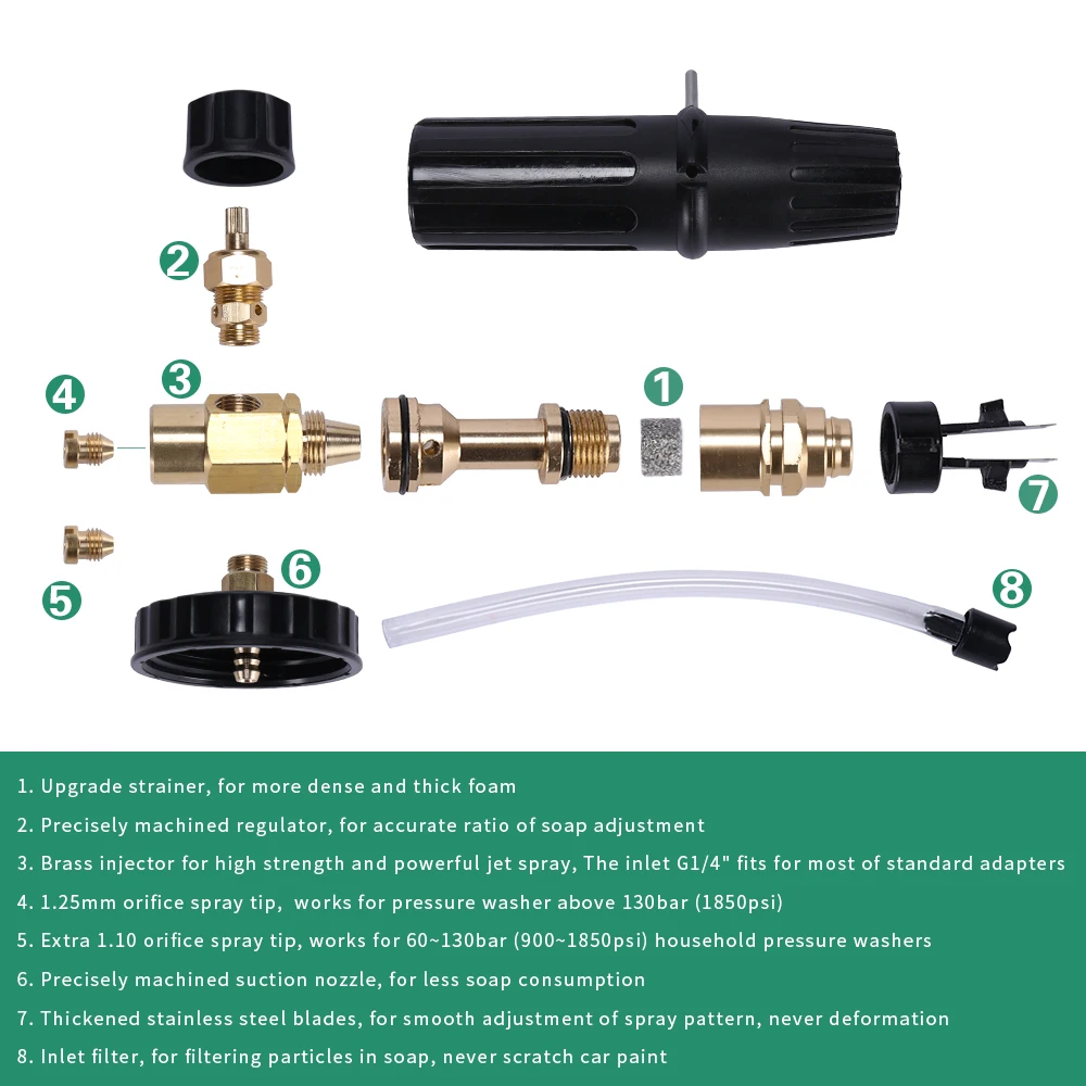 4. Помимо прочего латунная насадка 1,1 мм для создания обильной пены на 60 ~ 130bar (900 ~ 1850psi) малых моек высокого давления. Стандартный пенная насадка с 1,25 мм сопло установлен составляет, как правило, для мойки высокого давления выше 130bar (1850psi). Если вы имеете домашнем хозяйстве, установка для мытья под давлением, для создания густая пена, пожалуйста, разобрать 1,25 мм сопло из пенная насадка с плоская отвертка, и собрать 1,10 мм к вашему Высочайшее качество образования пены.