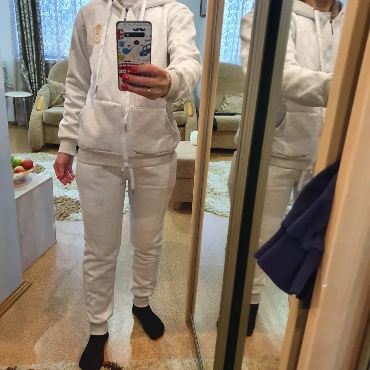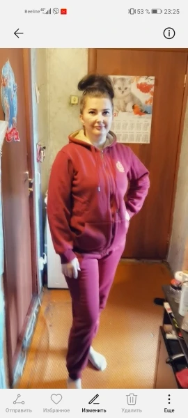 Очень качественный теплый костюм! Размер ХХЛ на параметры 90/80/100 см, немного великоват, но не критично. Резинка по талии у штанов села плотно. По бедрам идеально! Слегка свободно на ляжках и икрах . Длина, на рост 158 см, с запасом. Толстовка длинная. Села, как надо. Не обтянула. Думаю, что меньший размер не будет такой комфортный, т.к. будет сковывать движения. Ткань - очень мягкий, плотный трикотаж. Внутренний меховой утеплитель по всему костюму. Посылка шла очень долго! По треку видно, что медленное передвижение было уже в нашей стране. Чудесный костюм! Советую однозначно! Продавцу спасибо!