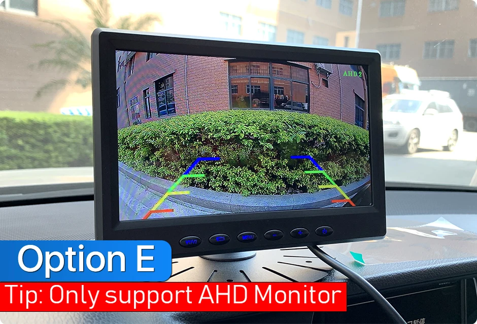 Через управление сигналом, он может поддерживать CVBS и AHD дисплеи.• D камера(CVBS )+( 1280x720 )+( 170 °)Обрежьте белый кабель →( AHD )+( 1280x720 )+( 170 °)• Камера E(AHD1080P )+( 1920x1080 )+( 175 °)Обрежьте белый кабель →( CVBS )+( 1280x720 )+( 125 °)