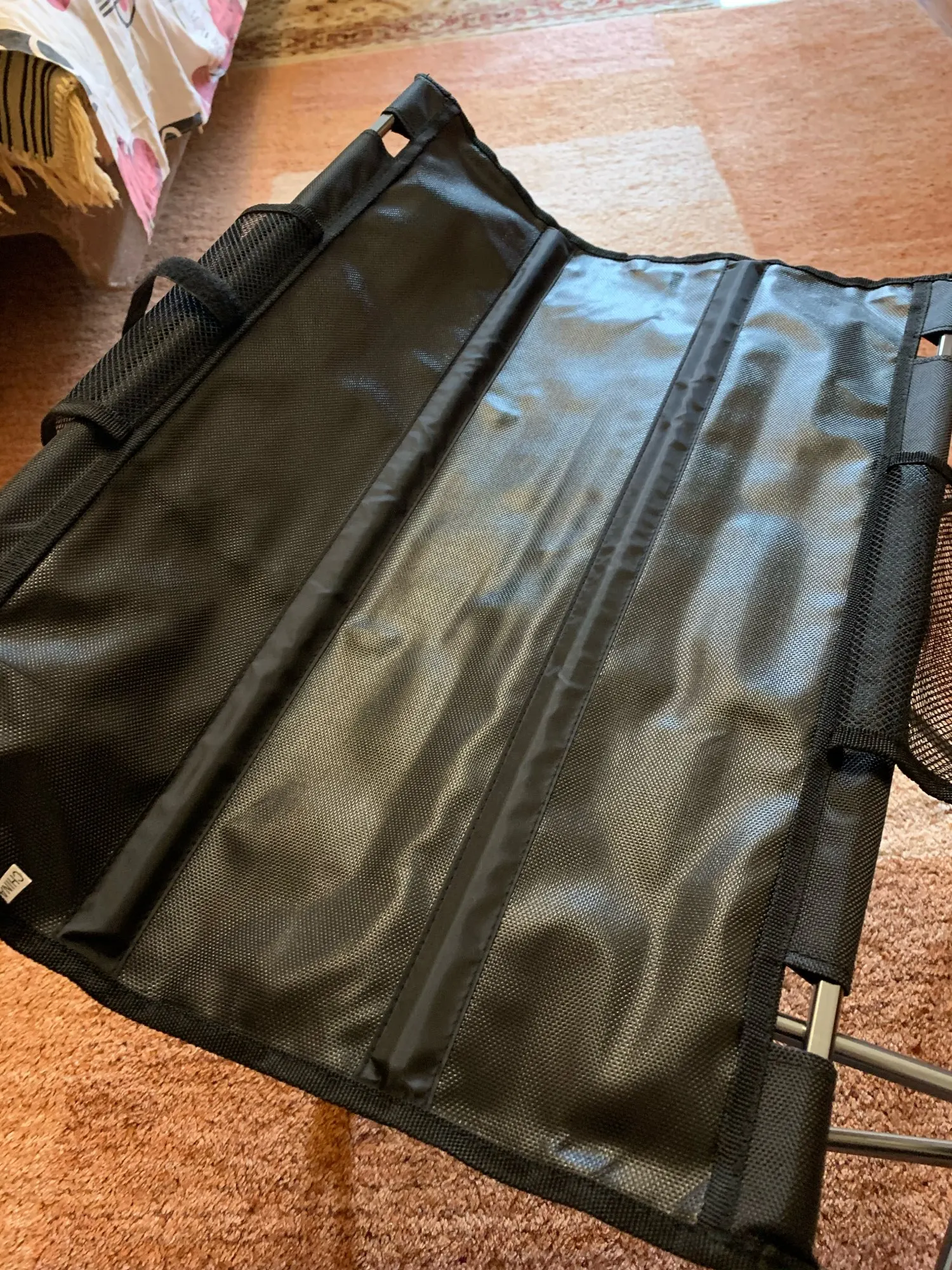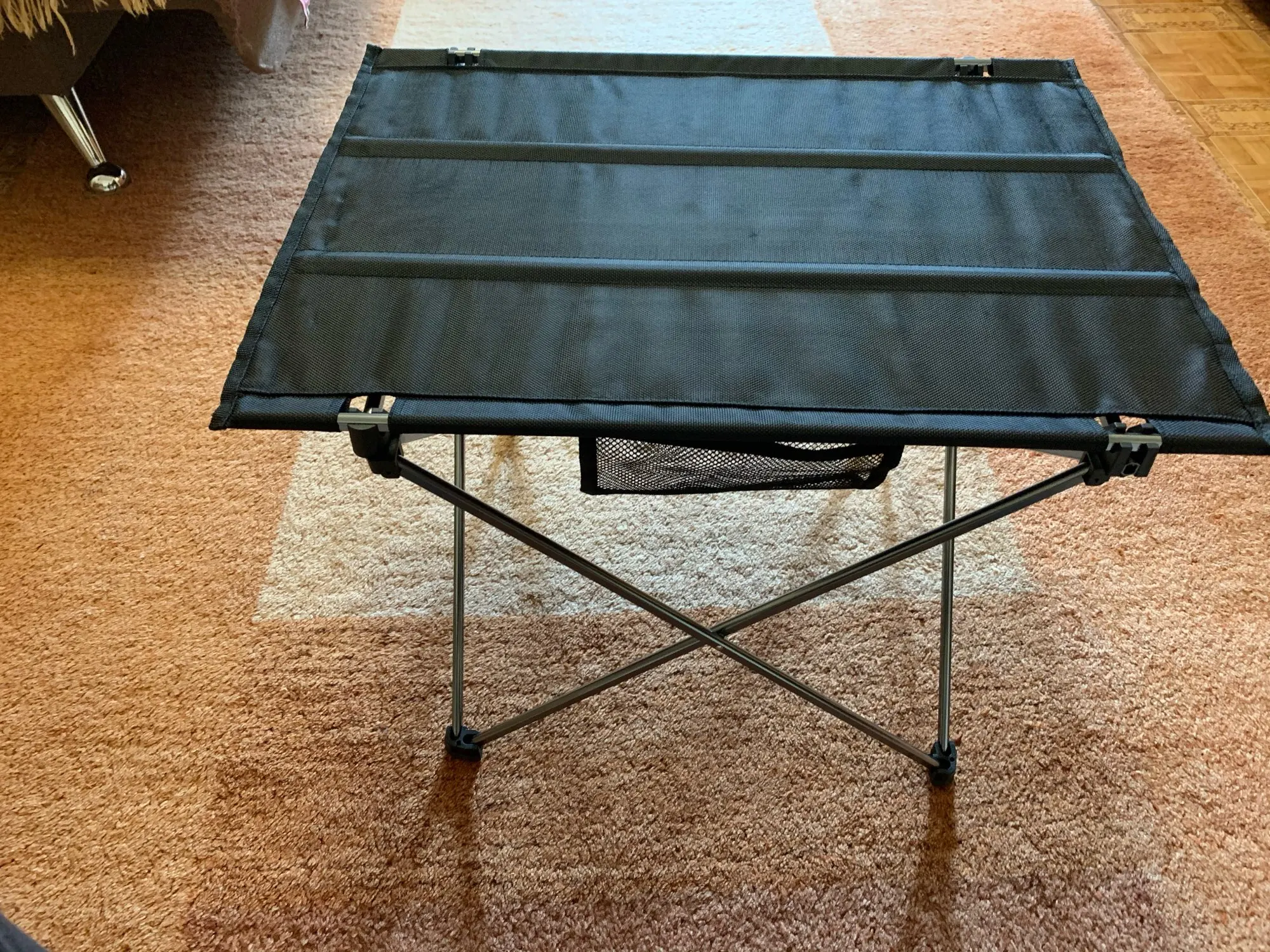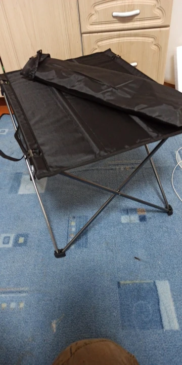 Столик приехал до Саратова за 10 дней, доставил курьер до двери. Конструкция внушает доверие, ножки сделаны из стали, поверхность стола матерчатая, с обратной стороны прорезиненная, что не будет давать ей промокать. Собирается и разбирается очень просто. Имеются 2 небольших кармашка с обеих сторон для телефонов. Если пользоваться бережно, уверен будет служить долго.