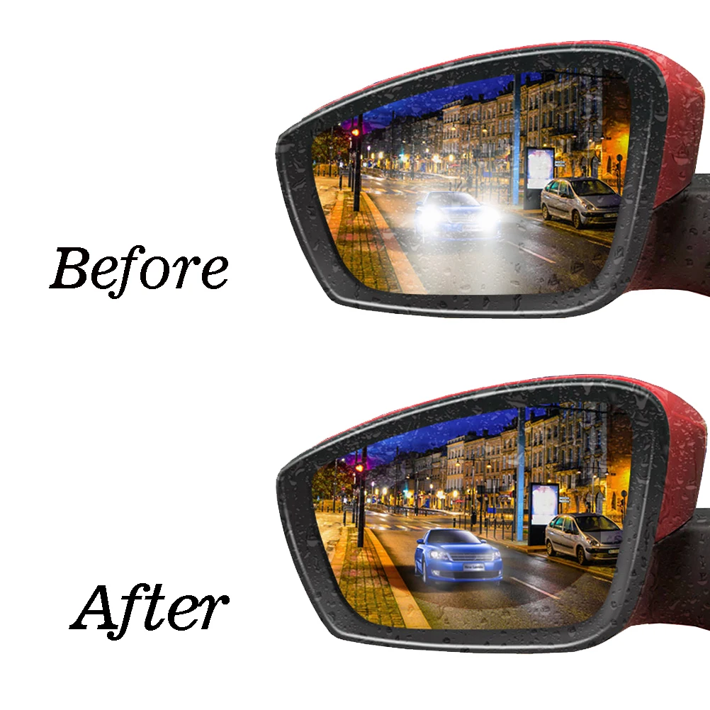 6.PET + Nano Защитная пленка с коэффициентом пропускания 99%, антибликовым покрытием, противотуманным, анти-туманным, водонепроницаемым, непромокаемым, который эффективно защищает вашу безопасность вождения в ночное время или в дождливый день, держите зеркало заднего вида чистым все время.