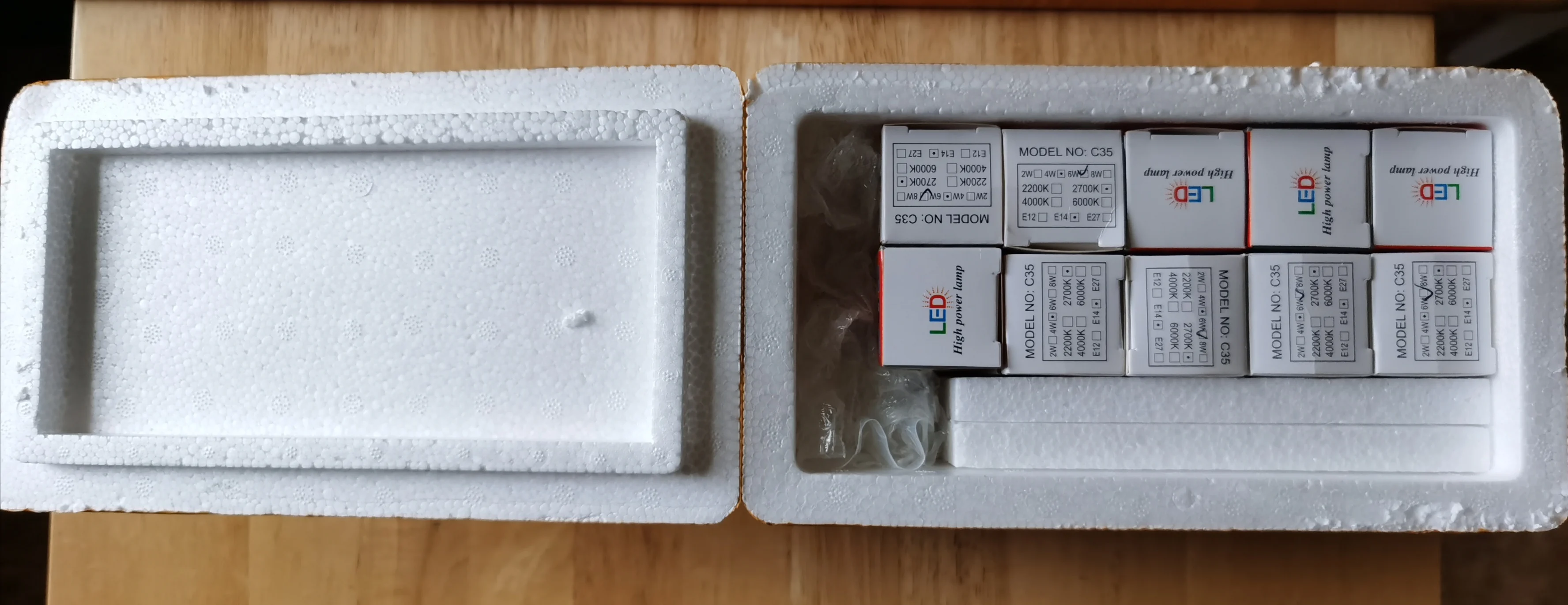 Он прибыл хорошо защищен и в белой пробковой коробке, обернутой в упаковочную ленту. Из-за этого было трудно узнать, где открыть или где разрезать. Однако содержание было в хорошем состоянии, и они горели довольно много. Теперь мы должны увидеть, как долго они прослужат