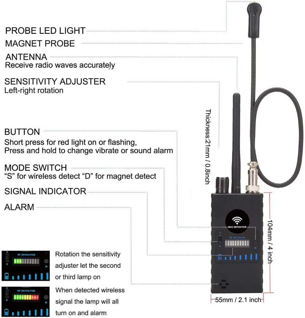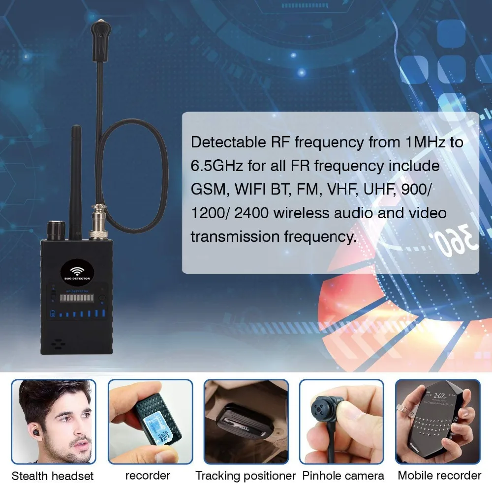 Обнаруживает скрытую беспроводную WiFi камеру и беспроводное прослушивание.