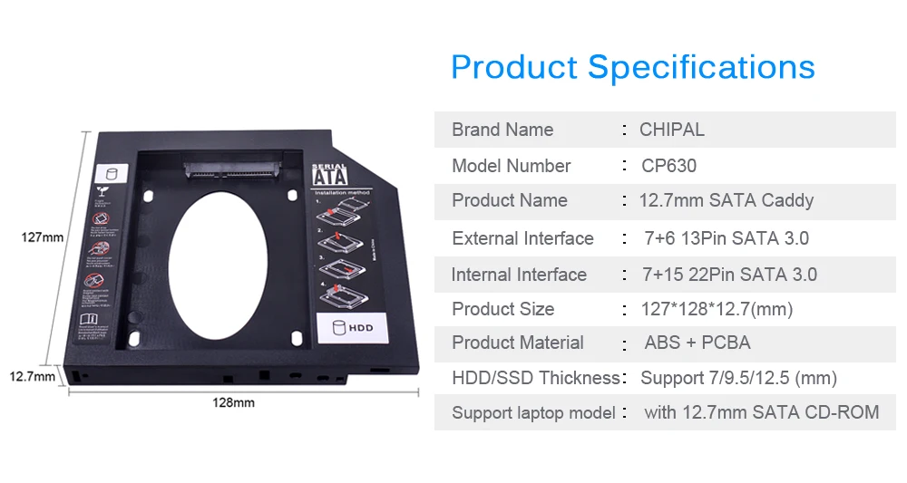 CHIPAL Универсальный SATA 3,0 2nd HDD Caddy 12,7 мм для 2,5 "2 TB SSD HD жесткий диск Корпус для ноутбука CD DVD ROM Optical Bay