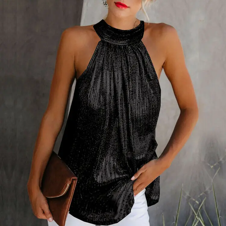 Модная женская золотистая блузка с высоким воротом без рукавов, топ без рукавов, жилет, Повседневная Свободная рубашка, футболка на лето