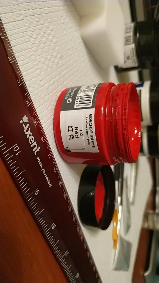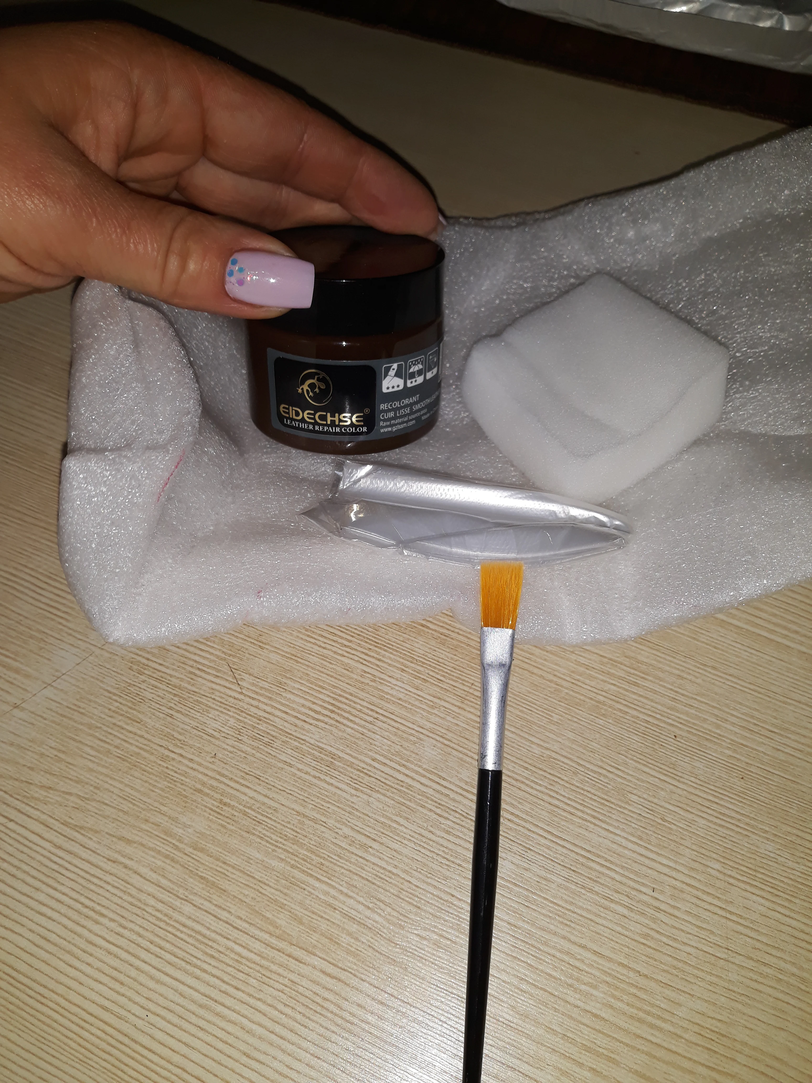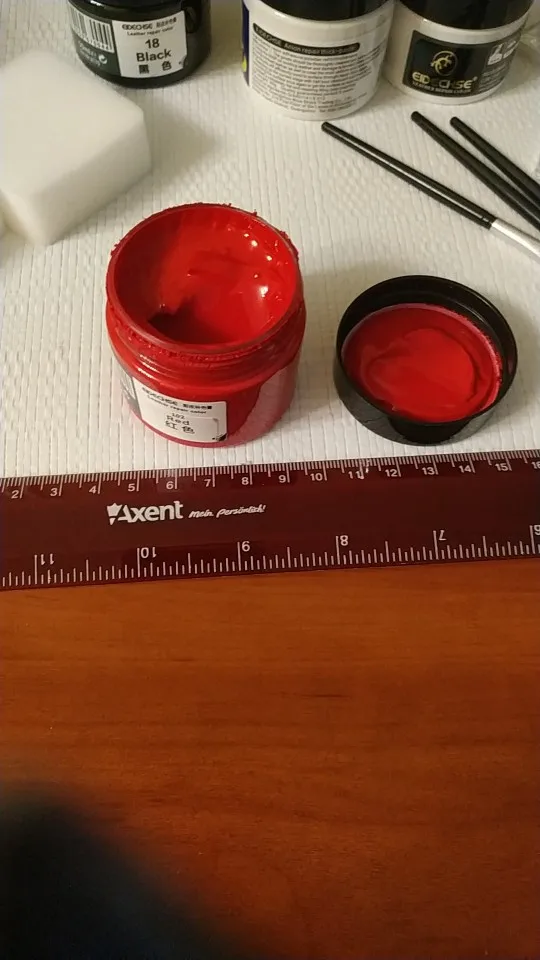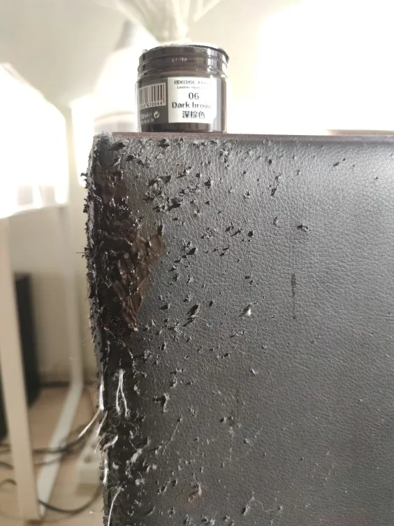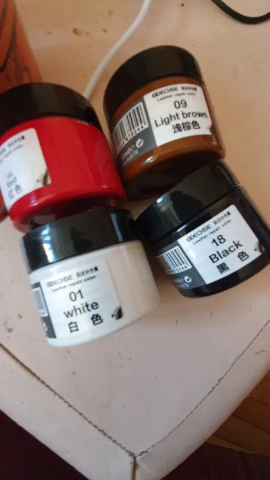 Продавец молодец! Очень быстро отправил заказ, и до России быстро заказ дошел, но потом товар надолго пропал. Товар получили, но долго не могли открыть, оказывается краска вытекла и склеила крышку с баночкой. Баночка небольшая, в комплекте кисточка, перчатки и губка. Для глубоких царапин понадобится очень много слоев нанести, но это естественно не кожа, а просто замазка цветная. После высыхания не красится, водой не смывается.