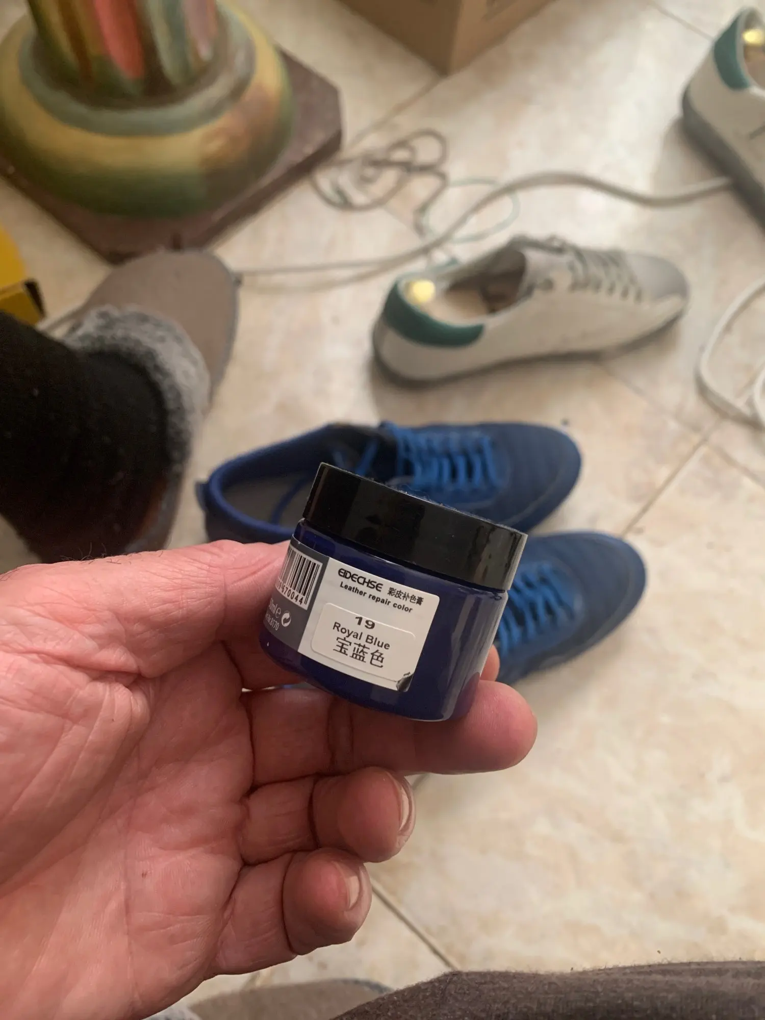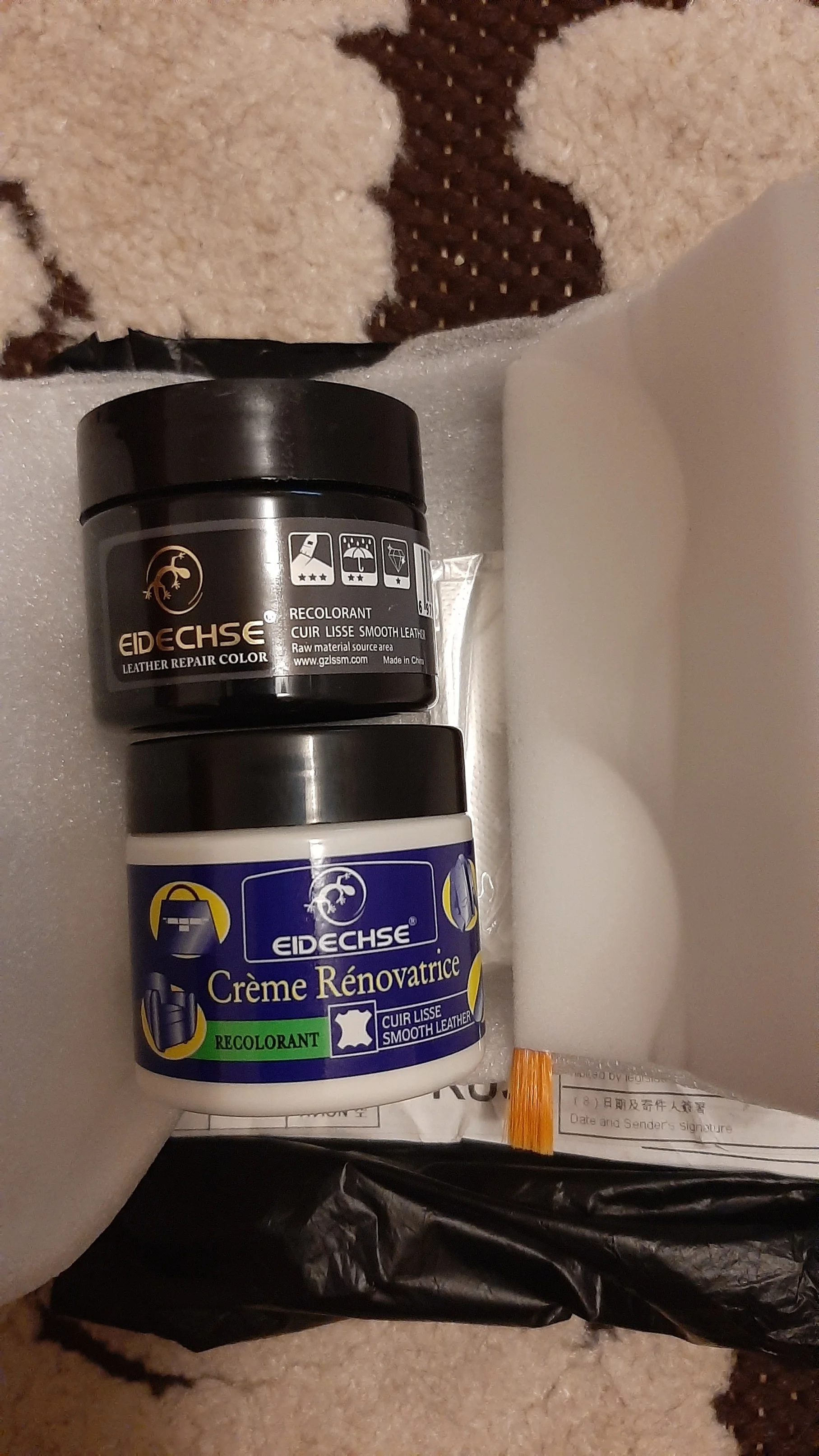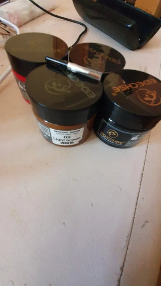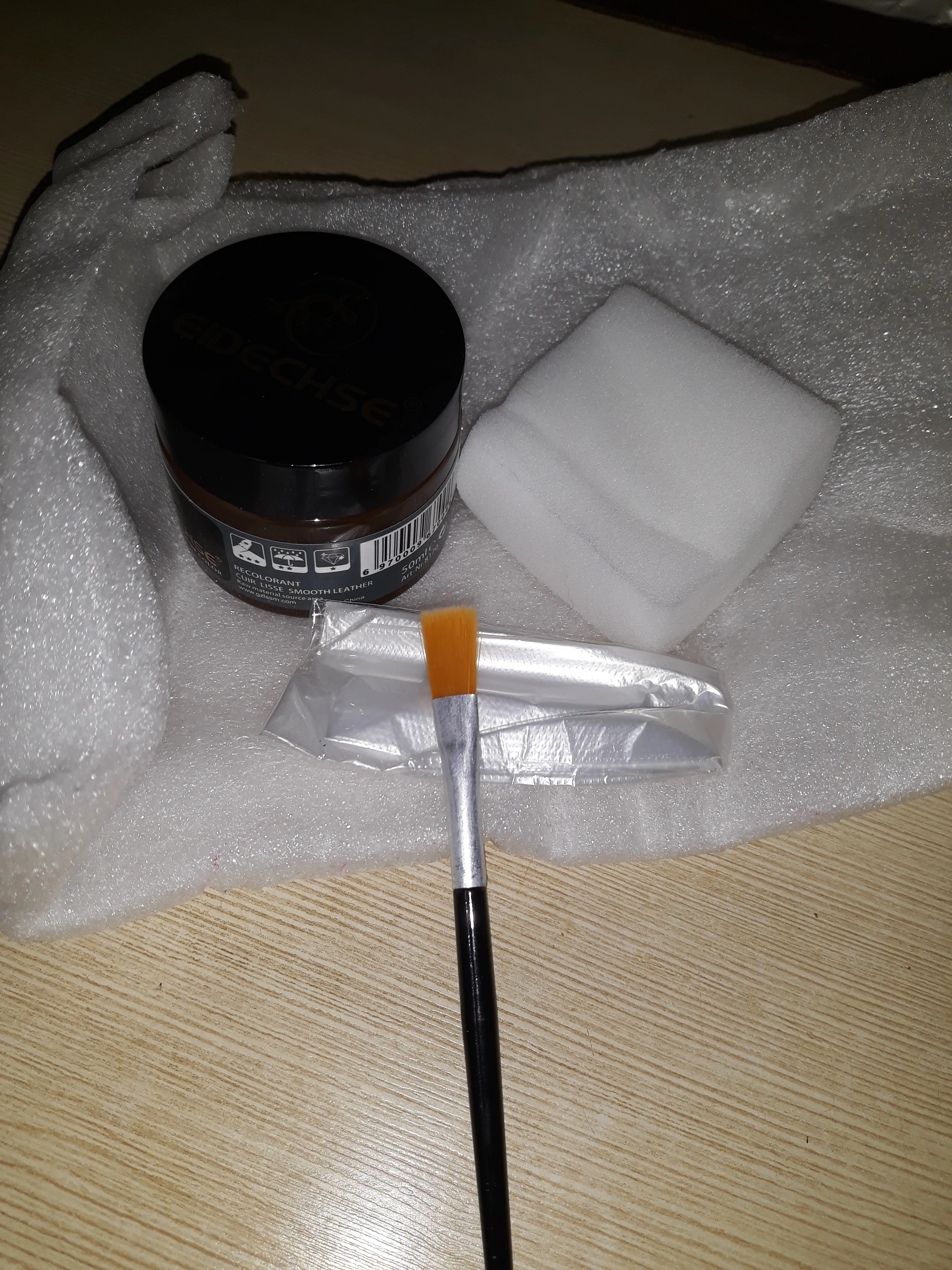 Продавец молодец! Очень быстро отправил заказ, и до России быстро заказ дошел, но потом товар надолго пропал. Товар получили, но долго не могли открыть, оказывается краска вытекла и склеила крышку с баночкой. Баночка небольшая, в комплекте кисточка, перчатки и губка. Для глубоких царапин понадобится очень много слоев нанести, но это естественно не кожа, а просто замазка цветная. После высыхания не красится, водой не смывается.