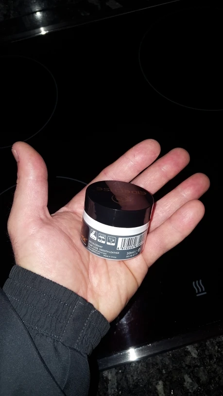 Баночка диаметром 2,5 см. Не высокая. Закрасили кожзам от кошкиных когтей. Не восстанавливает, но если густо покрыть скрывает недостатки. В целом не плохо. Главное подобрать цвет. Но в данном случае оказалось это не так просто. Думаю с чёрным будет неплохой вариант.