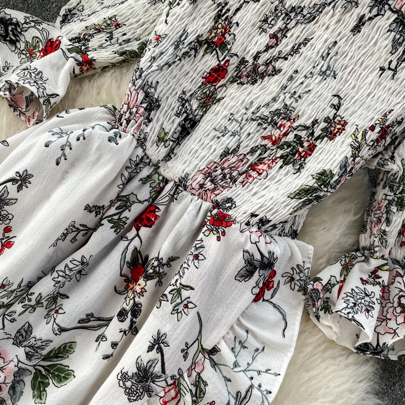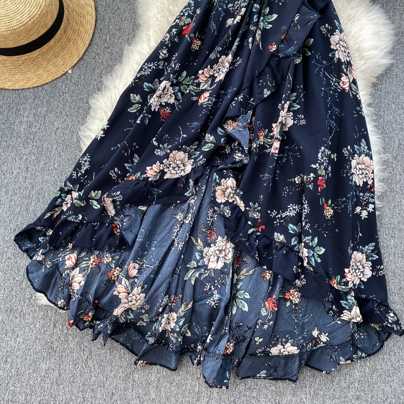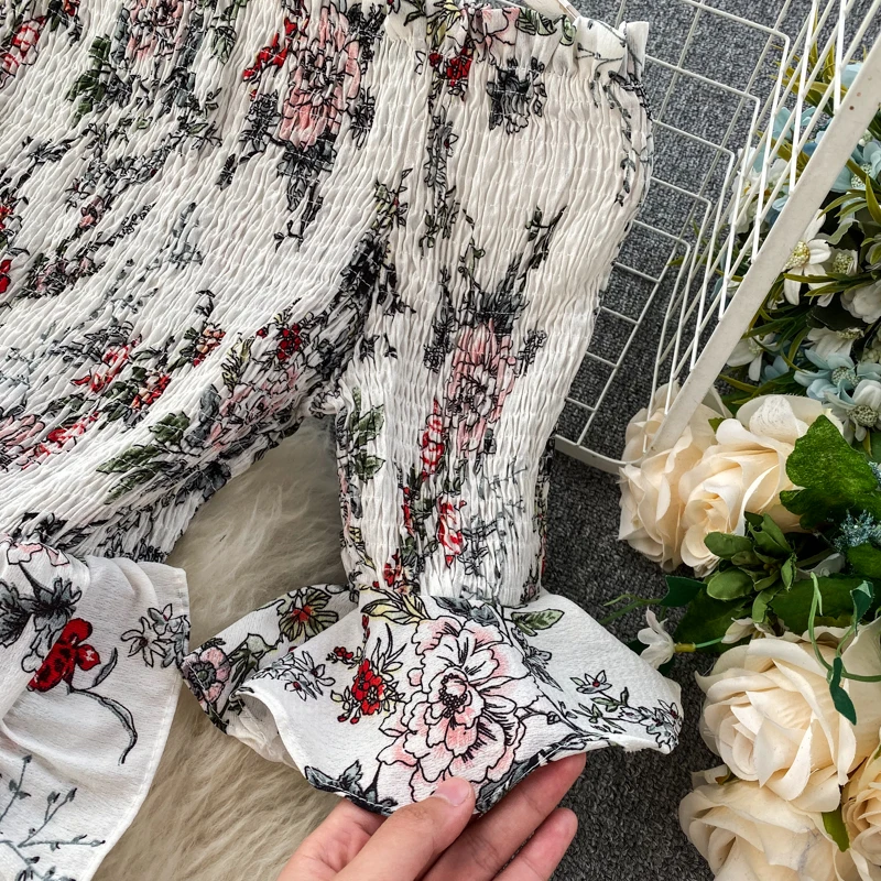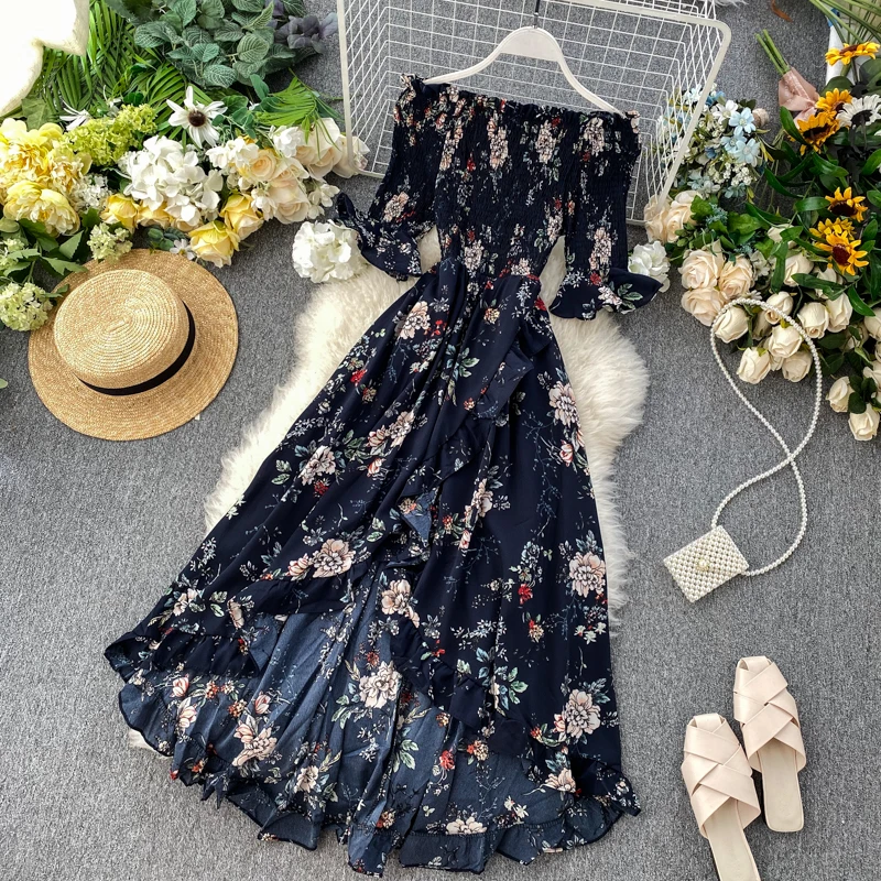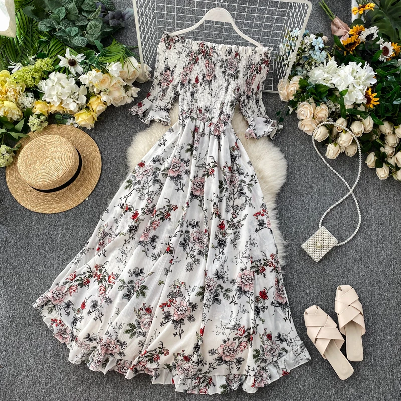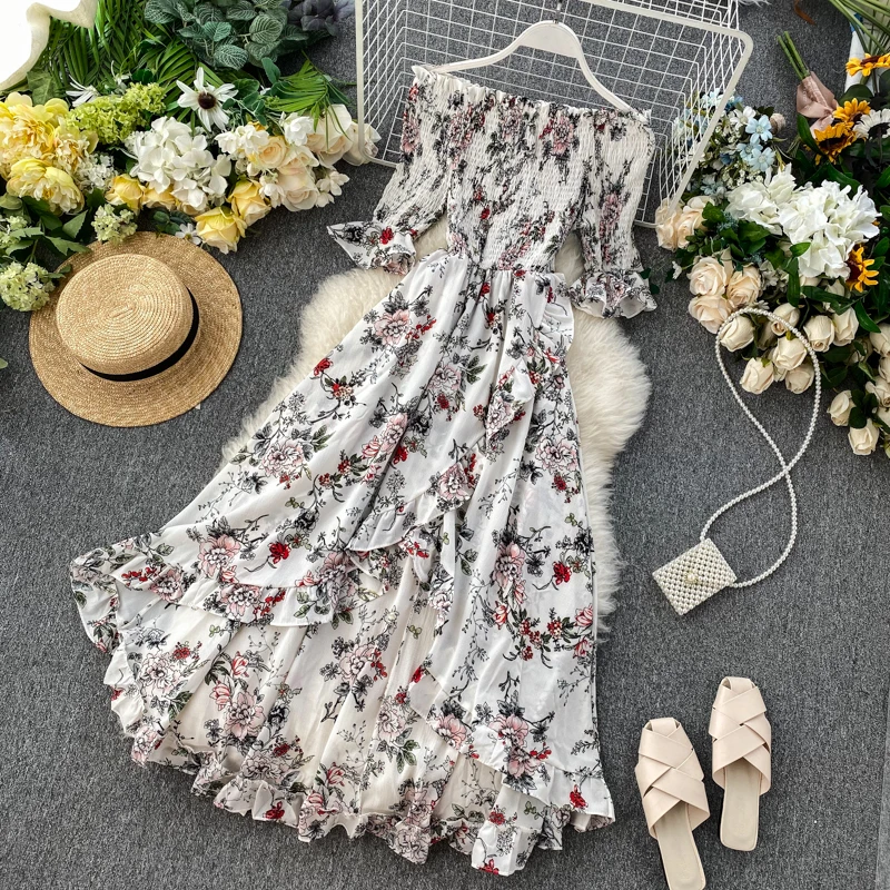 Женское винтажное платье с цветочным принтом, летнее Элегантное Длинное платье с открытыми плечами и высокой талией, повседневное богемное праздничное платье с коротким рукавом