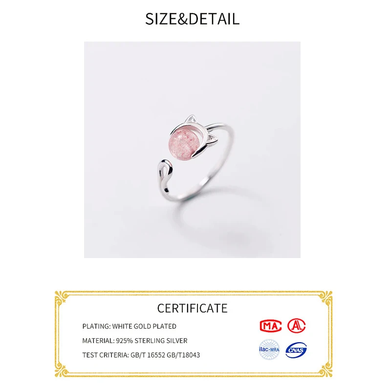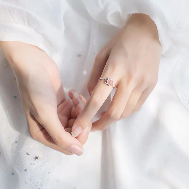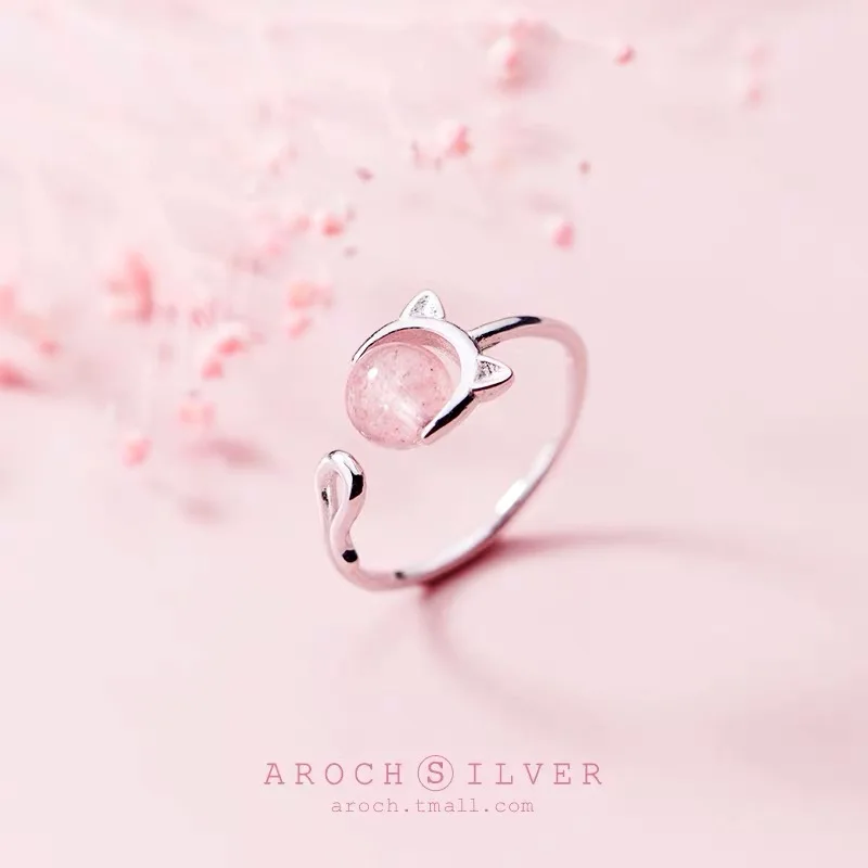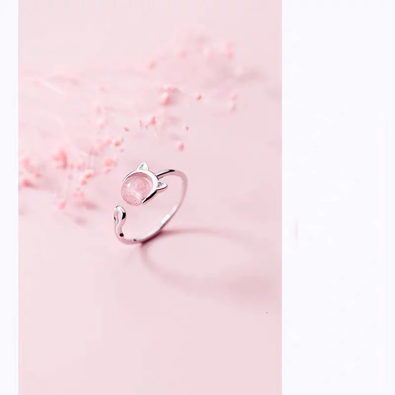 Кольцо регулируемое женское, изящное вечернее Ювелирное Украшение из настоящего серебра 925 пробы с котом и клубникой