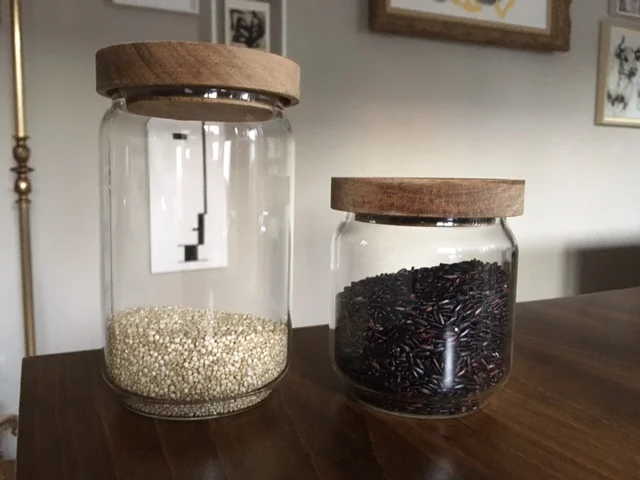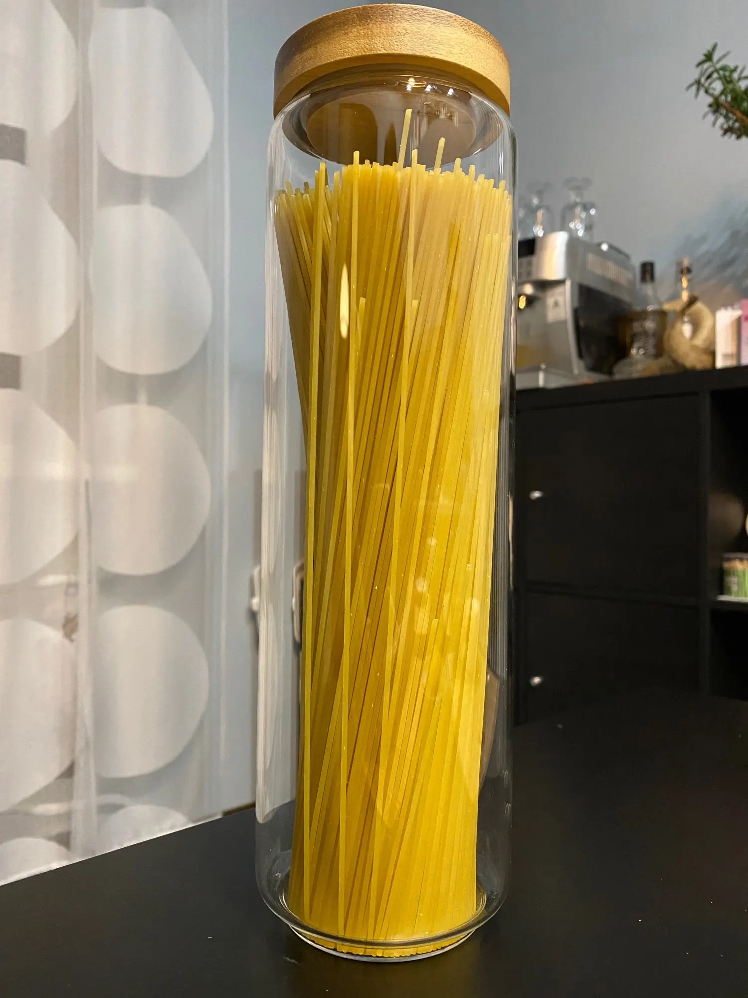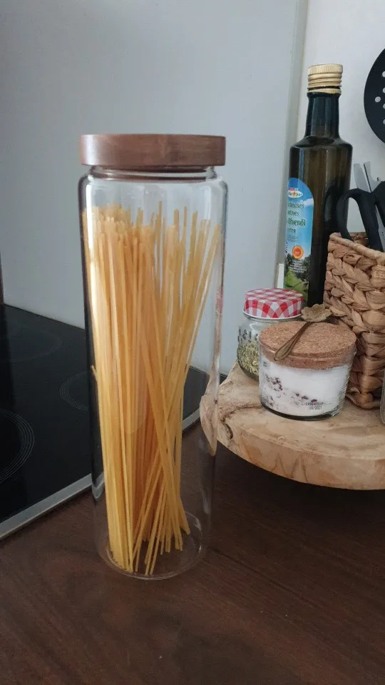 Банки очень красивые и практичные. Я сделал несколько размеров. Самый маленький размер (350 мл) размещает в домашних условиях 200 г тертого кокосового ореха, емкость объемом 1250 мл позволяет хранить 1 кг риса или кусков, емкость объемом 1550 мл предназначена для спагетти. Я мог бы положить 1 кг, но есть еще около 200 г, я думаю. У меня также была предыдущая покупка, что 950 мл, где я разместил 800 г киноа.