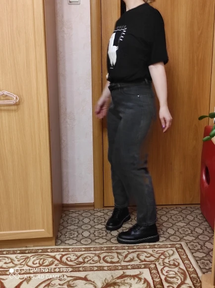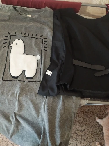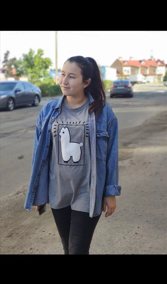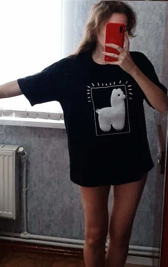 Прикольная футболка! Ткань не очень приятная на ощупь. Жестковата. Наверное синтетика. Но на теле так не ощущается. Нормально. Брала из-за ламы! Она классная :) Стирку перенесла хорошо. Не полиняла. Ношу размер XS-S. Рост 168 см, вес 51 кг. Взяла L. Мне рукава до локтя, почти закрывает попу. Можно заправить и подвернуть рукава. Подходит для беременного живота. Есть куда расти. Думаю до 7 месяцев комфортно будет. Побоялась утонуть в XL. Но если нужен прям оверсайз, то можно. Рекомендую!