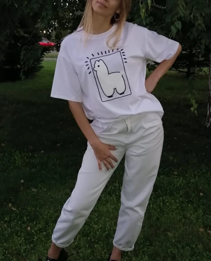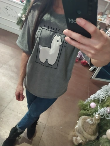 Футболка хоть и сентетика, но очень приятная к телу и мягкая! Точно такая же, как на картинке. Чтобы было как на модели, берите xl (если у вас фигура как у нее), однако и мне подошло (рост 160 и вес 50), хотелось бы рукава подлиннее, но и так смотрится отлично! Лама пушистая и очень милая! Брала для занятий танцами, думаю, что как раз, потому что она легенькая! Не такая уж и плотная, но для алиэкспресса очень хорошее качество! Произошла заминка и я хотела отменить заказ, поэтому связывалась с продавцом, он просто душка! Всё быстро решили. (к сожалению, заказ уже был отправлен, поэтому я её все же получила, хоть и хотела отменить, но как только увидела её – просто влюбилась и все сомнения отпали!)