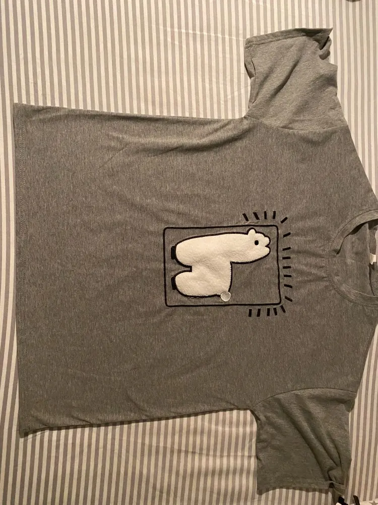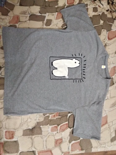 Похожа на фото, но только похожа, сам принт менее рельефный; хвостик вышит, а не объемный шарик; чолочки нет, футболка из хорошего материала, цвет брала белый (пришел холодный белый) на фото более теплый белый. Футболка стоит своих денег. Размер брала М, но если хотите как на фото берите L.
