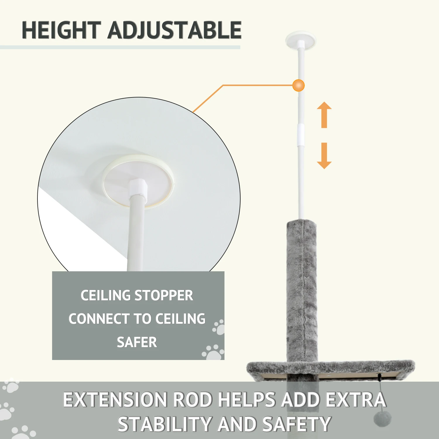 ·Свободное пространство и легко перемещается: когтеточки для кошек не занимают много места и удобны для переноски в любые места, которые вам нравятся: настенный уголок, балкон, гостиная, спальня. Натяжной стержень сверху можно отрегулировать на предпочтительную высоту от высокого до медленного размещения комнатного потолка. Не беспокойтесь о перемещении в нижнюю комнату или размещении на балконе с платформой.