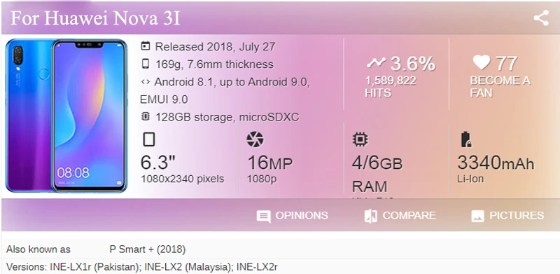 Номер моделиFor Nova 3i INE-LX1r INE-LX2 INE-LX2r/P Smart Plus 2018
