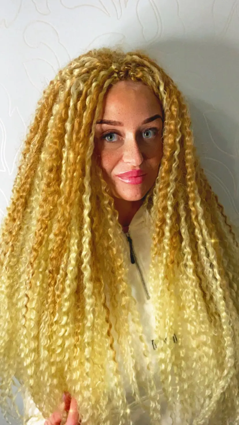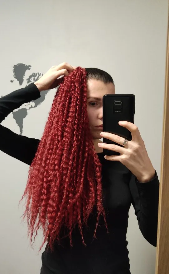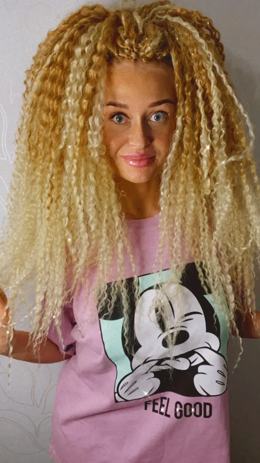 Доставка меньше двух недель, волосы хорошие, без блеска, выглядят натурально, при плетении скользят узелки, ушло 3,5 пачки, но хватило бы и 3 точно. Плетутся крючком на каркас из брейдов. Заходи в Инстаграм @evgen_anisimova , там много интересного.