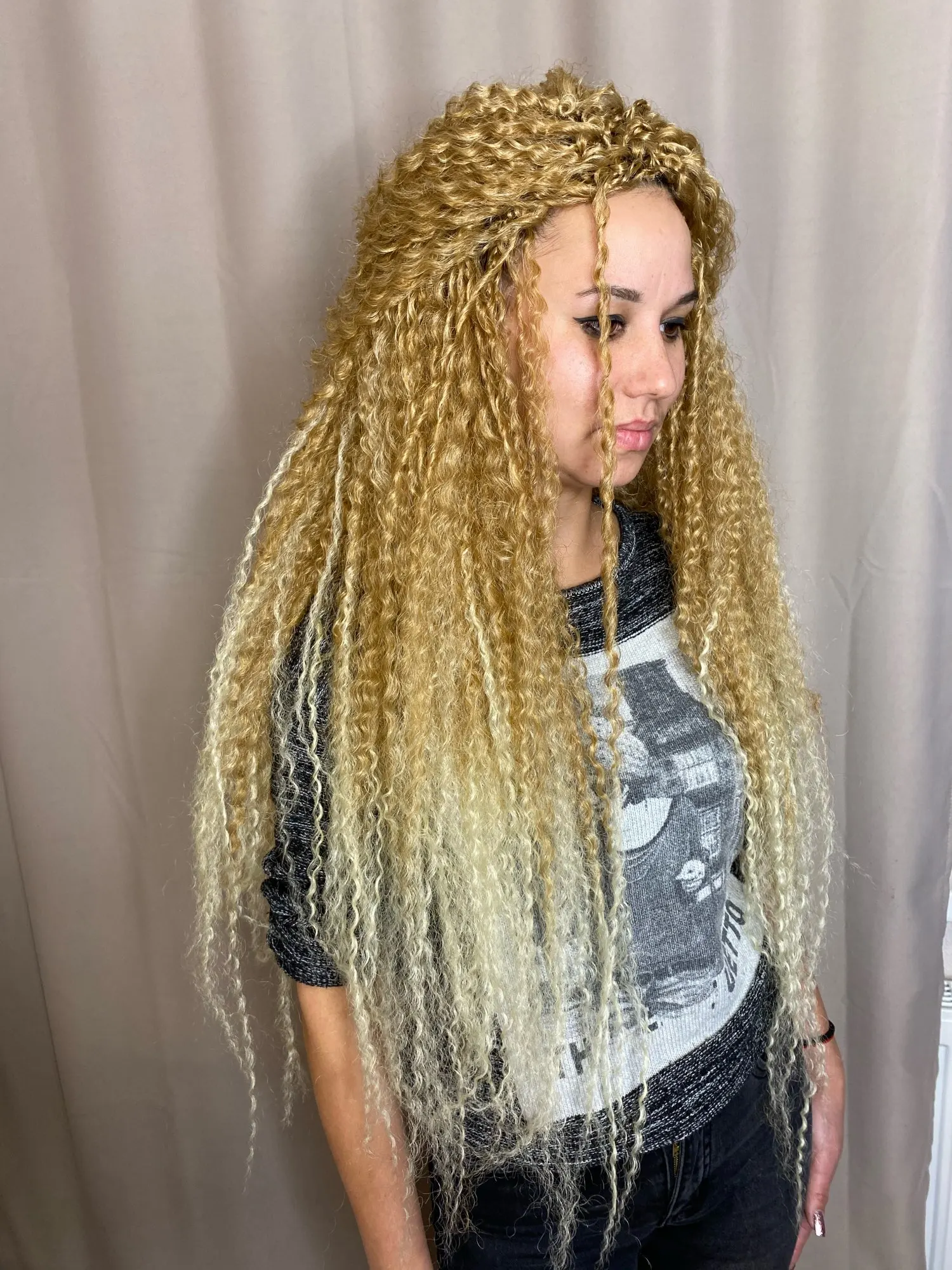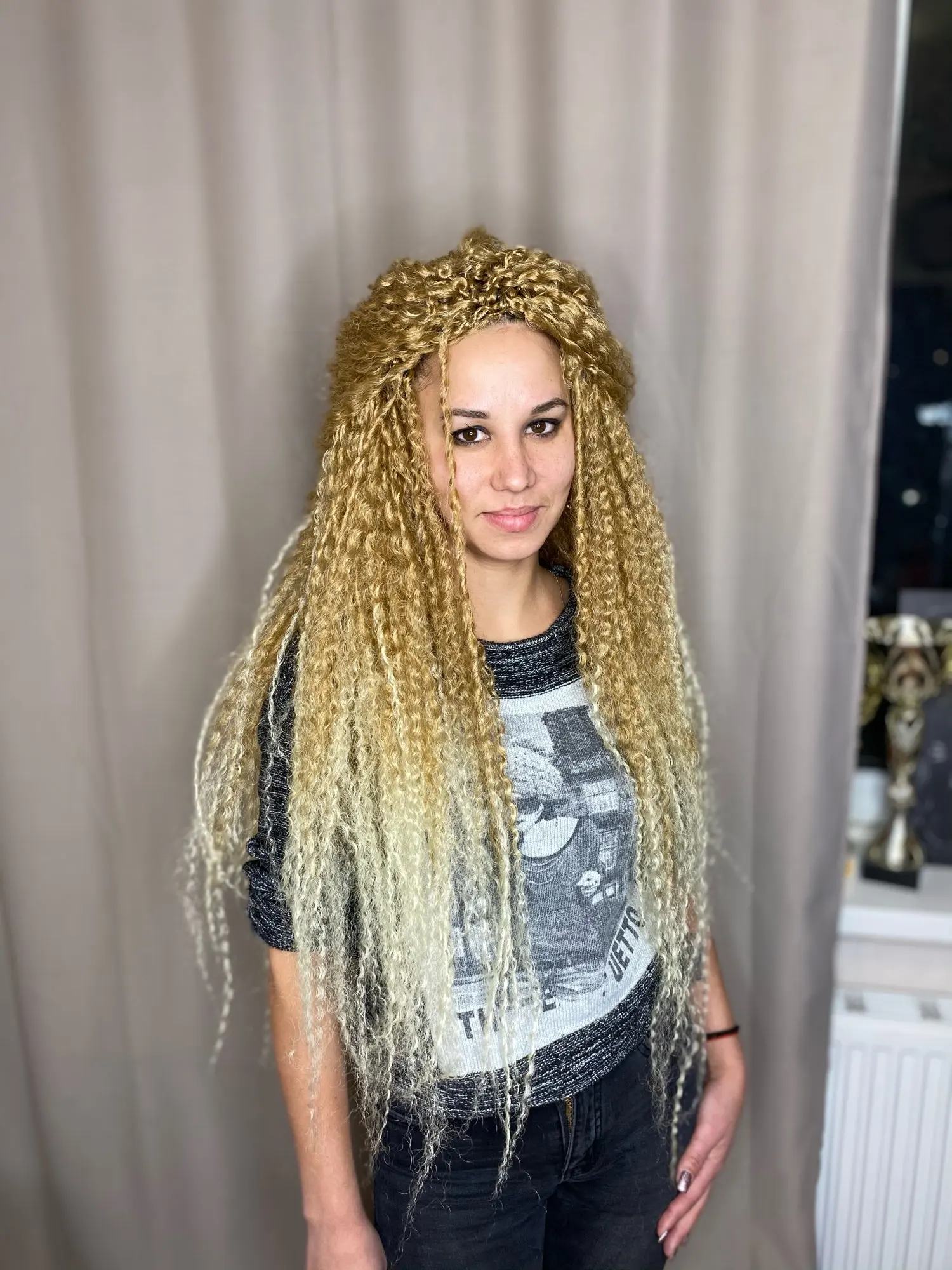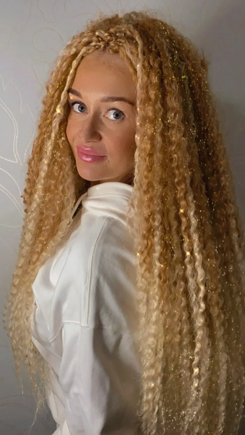 Доставка меньше двух недель, волосы хорошие, без блеска, выглядят натурально, при плетении скользят узелки, ушло 3,5 пачки, но хватило бы и 3 точно. Плетутся крючком на каркас из брейдов. Заходи в Инстаграм @evgen_anisimova , там много интересного.