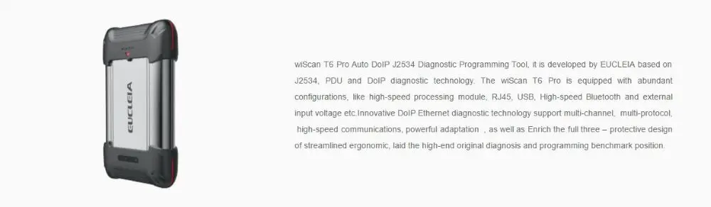 WiScan T6 Pro Auto DoIP J2534 диагностический программный инструмент, он разработан EUCLEIA на основе технологии диагностики J2534, PDU и DoIP. WiScan T6 Pro оснащен множеством конфигураций, таких как высокоскоростной модуль обработки, RJ45, USB, высокоскоростной Bluetooth и внешнее входное напряжение и т. д. Инновационная технология DoIP Ethernet для диагностики поддерживает многоканальные, многопротокол, высокоскоростную связь, мощную адаптацию, а также обогащает весь трехзащитный дизайн обтекаемой эргономики, Положили первоклассную оригинальную диагностику и контрольную позицию программирования.