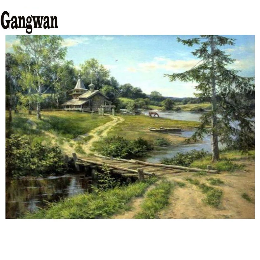 Алмазная вышивка Деревня и озеро, мозаика из натуральных страз, Наб...