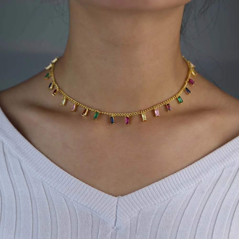 Модные золотые, Серебристые цвета, цветные, радужные, ручная работа, багет, CZ камень, цепочка, Чокеры для женщин, очаровательные вечерние ожерелья, ювелирные изделия
