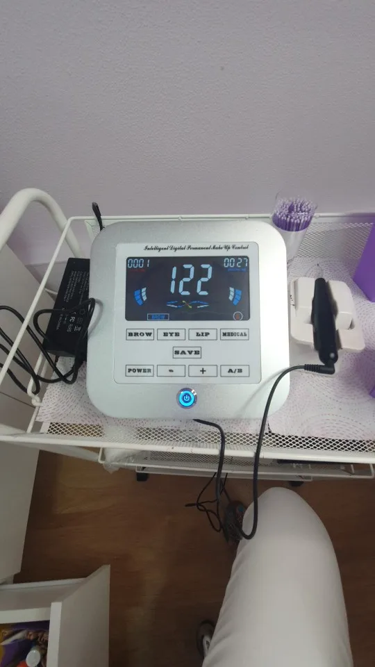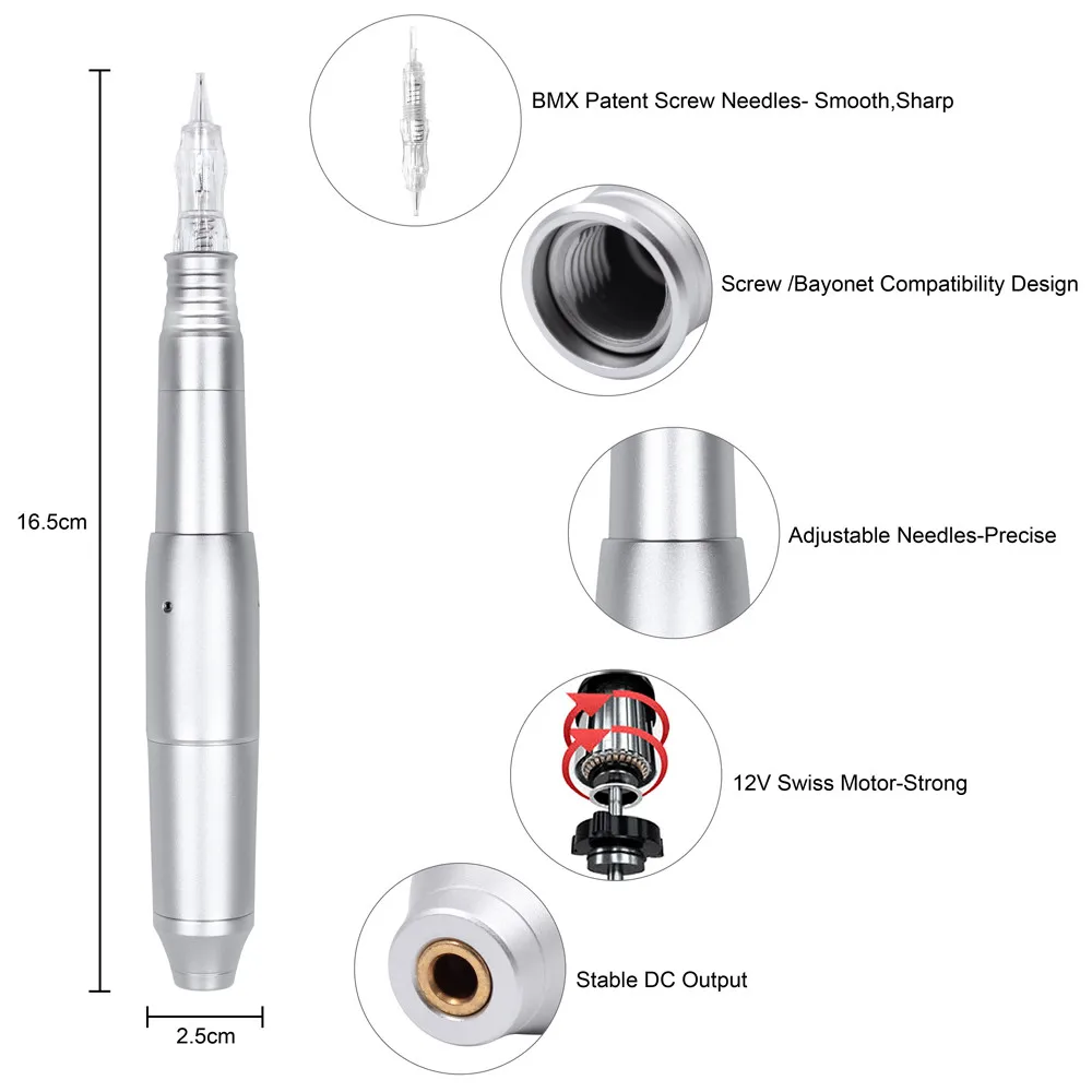 Применение бровей/eyeline/губ/MesoСкорость ручки Макс. 10000 об/минМакс. 12 В на входе ручкиБескаркасный мотор для ручкиКорпус ручки из алюминияИглы винтовой картридж иглыВыход источника питания Макс. 12, 200npsВход питания 90-240 ВКорпус блока питания CNC алюминийЗажим Держатель алюминий/железо