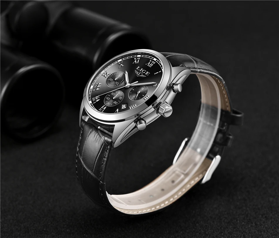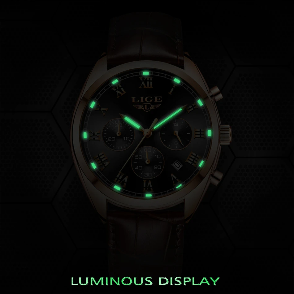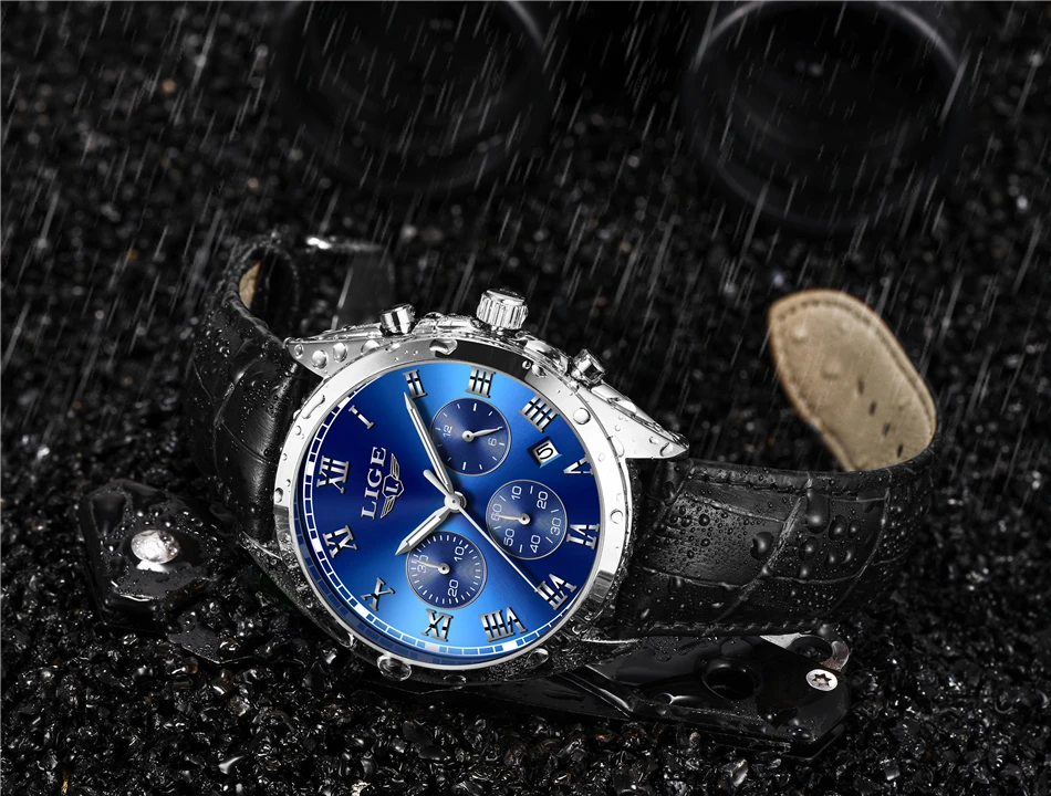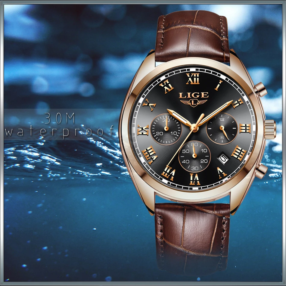 Часы наручные LIGE Мужские Спортивные кварцевые, роскошные брендовые многофункциональные водонепроницаемые деловые, с кожаным ремешком, с коробкой